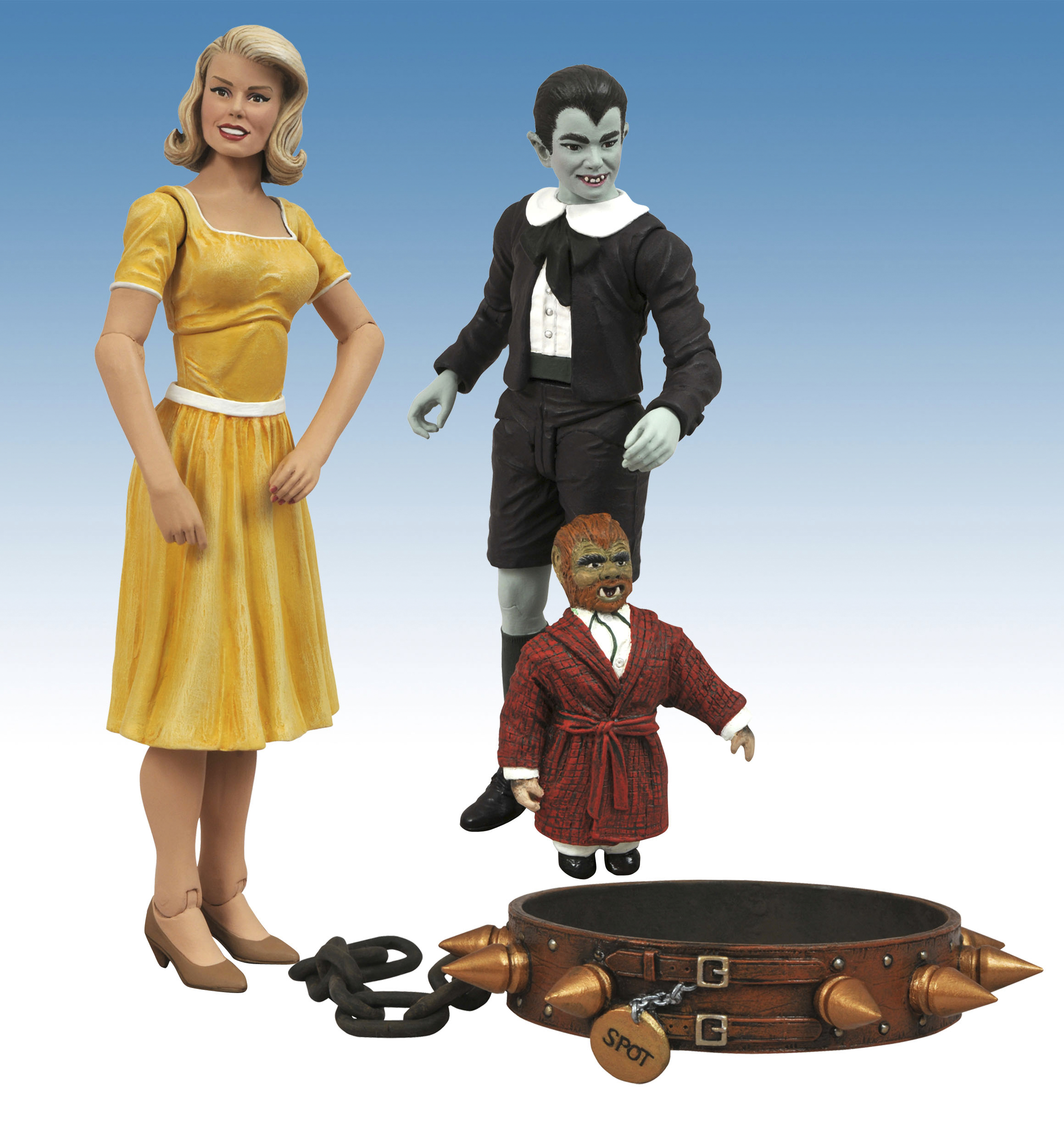 A Diamond Select Release! Sculpted by Jean St. Jean! Voted Best New License of 2011 by Cool Toy Review, DST's hit 7" Munsters line continues with the next two figures in the family, Eddie and Marilyn! The two youngest members of the Munster clan come as a pair, side-by-side in oversized Select figure packaging, along with character-specific accessories! The missing piece in your Munsters collection!