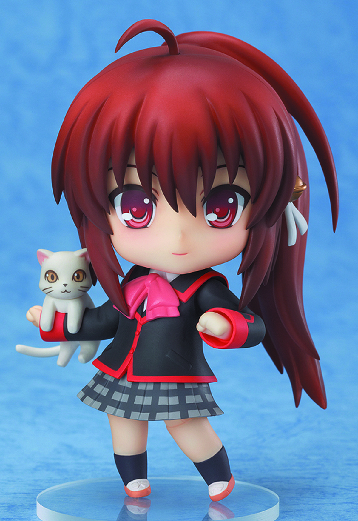 Little Busters! comes a Nendoroid of the main heroine, the cat-loving Rin Natsume! Her characteristic ponytail, slightly oversized blazer and pleated skirt have all been shrunk down into cute Nendoroid size for fans to enjoy. She also comes with three different expressions including a smiling face, an embarrassed face and a hissing cat face that works perfectly with the included cat ears! A load of other optional parts are also included, such as a baseball glove and ball so the team can practice, as well as two of her favorite cats - Lennon and Dorj. A cat toy is also included so she can play with the cats, allowing you to recreate even more scenes from the series!