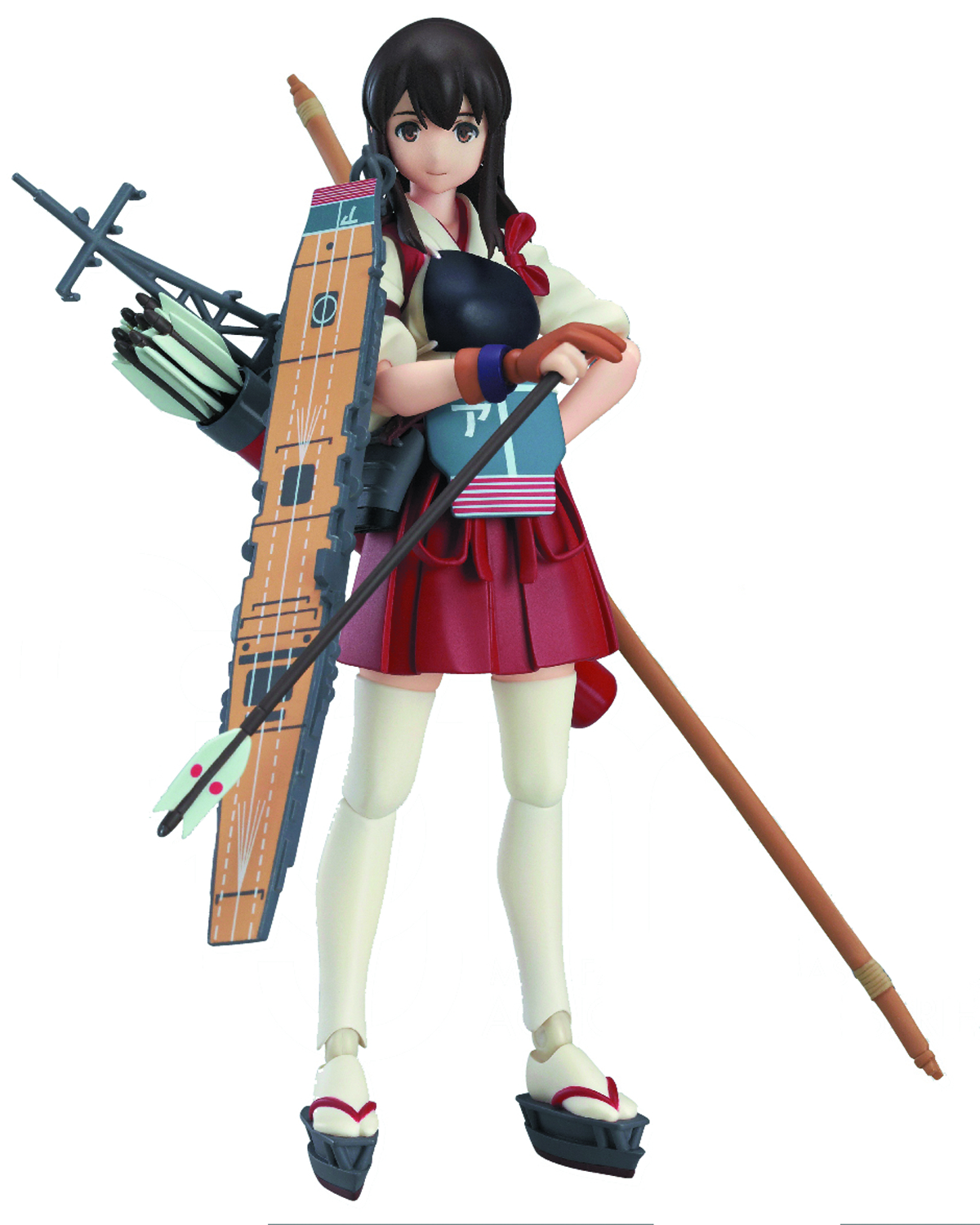 Akagi! The ship deck on her back is articulated at the base to allow posing in a variety of angles. Areas such as the base of her quiver and her shoulders make use of soft materials for easy action poses. She comes with a standard expression and a half-damaged expression, as well as a satisfied expression for enjoying her rice. Optional parts include her bow, her arrows based on famous aircraft, a repair bucket, bauxite and a bowl full of rice. An articulated figma stand is included.