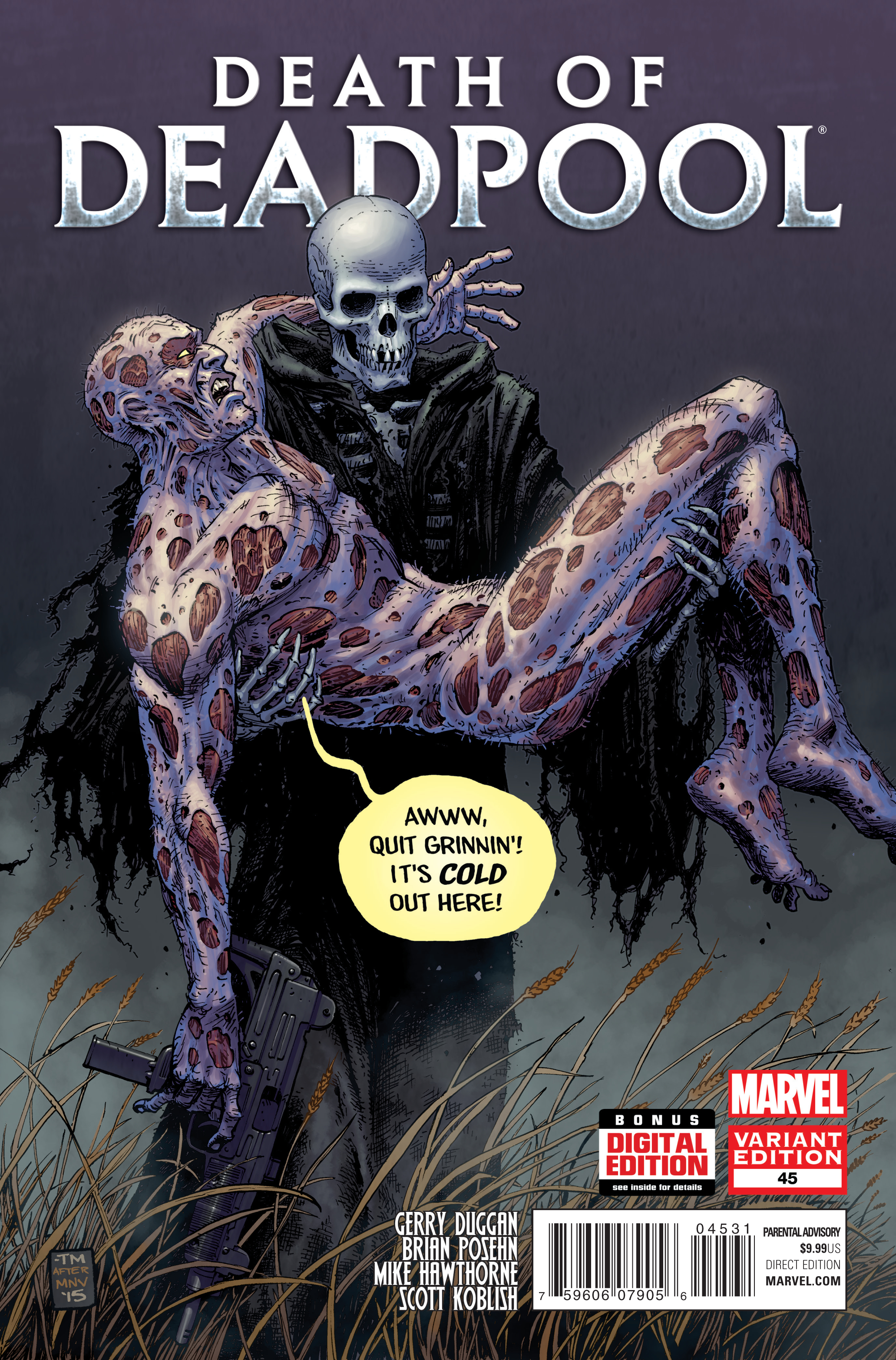That's right-if you add together all the Deadpool series (creatively) issue 45 is the big 250th issue of Deadpool! What better way to celebrate than to end the series? In our over-sized main story, ULTIMATUM comes at Deadpool for revenge, so he has no choice but to take them on-ALL OF THEM. Then, in an Infinity Gauntlet crossover, what would Deadpool do if he got the six gems from Thanos? Plus: a slew of stories showcasing Deadpool's closest friends and allies by special guest writers! Also, SPOILER: Deadpool dies at the end of the issue.