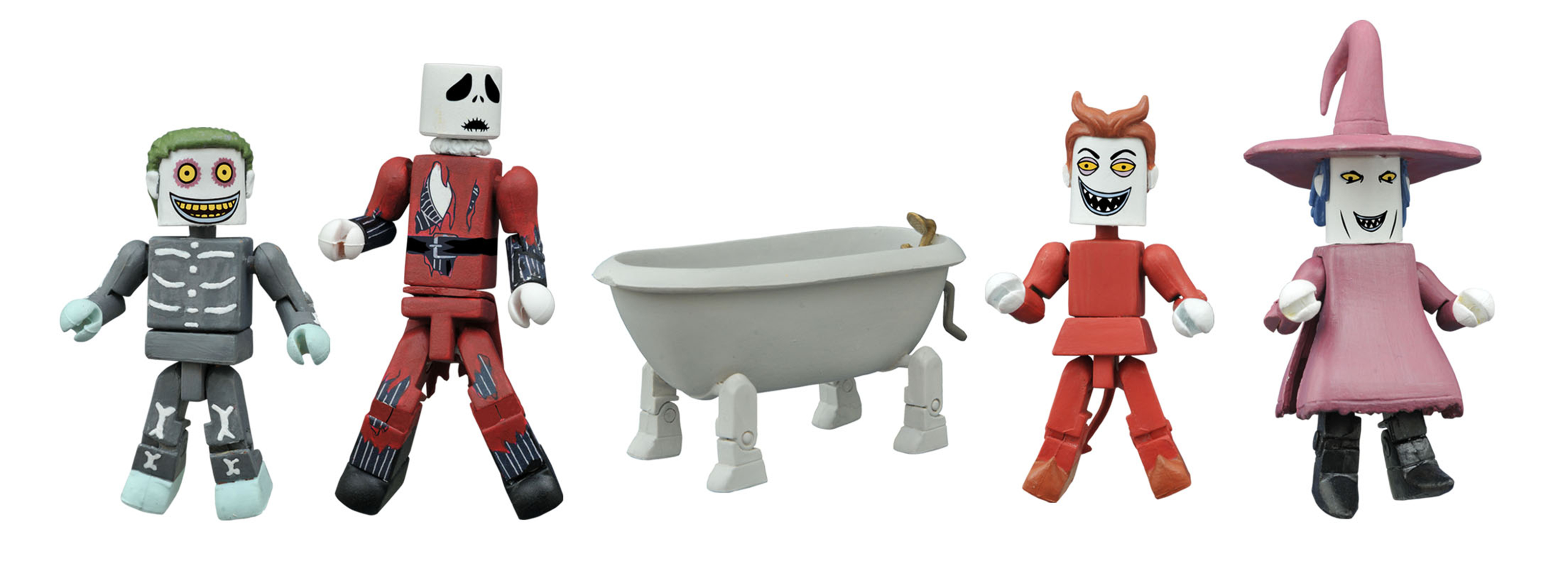 A Diamond Select Toys release! Now this is Halloween! The first-ever box set in the Nightmare Before Christmas Minimates line is the only place to get those three lovable scamps, Lock, Shock and Barrel, as well as a Battle-Damaged Jack Skellington in his tattered Santa Claus suit!! The three minions of Oogie Boogie each come with a removable mask, and they all fit inside the included walking Bathtub, which features articulated Minimates legs. Formerly a NYCC exclusive, this set is now available to all! Each 2-inch Minimates mini-figure features 10-14 points of articulation, as well as fully interchangeable parts. Designed by Art Asylum!