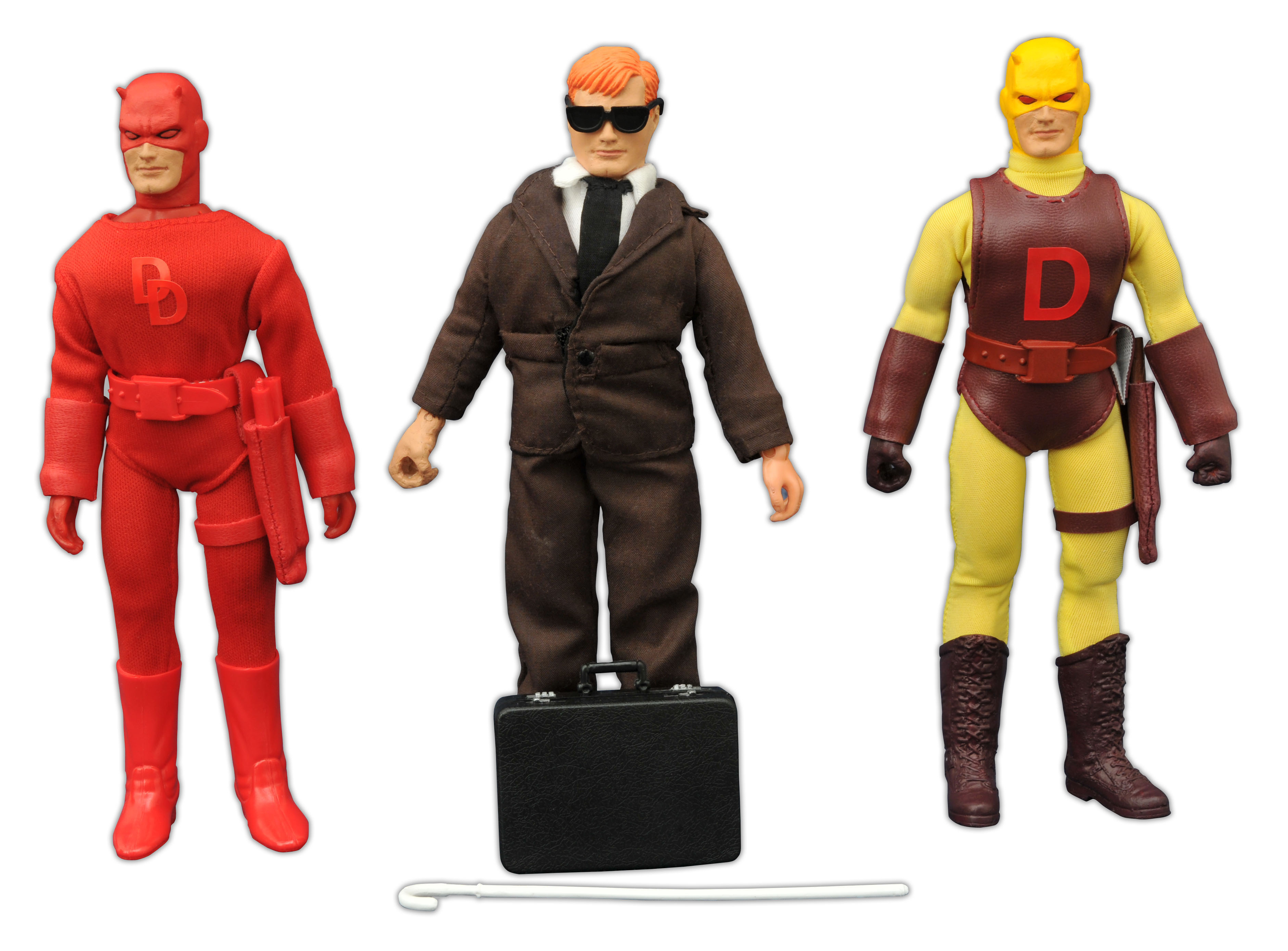 Finally, the devil has come to the Marvel Retro line! Never released in the classic Mego toy line of yester-year, streetwise superhero Daredevil is the latest Marvel character to get the Retro action figure treatment from DST! This gift set features one classically-styled red-costume Daredevil figure, in a vintage-style box, plus two additional heads and outfits: his original yellow costume and his alter ego, blind lawyer Matt Murdock! With interchangeable heads, hands, costumes and accessories, you can display your Daredevil however you want! Packaged in a full-color gift tray with a booklet about Daredevil, retro-style figures, and the creation process! Designed and sculpted by EMCE Toys!