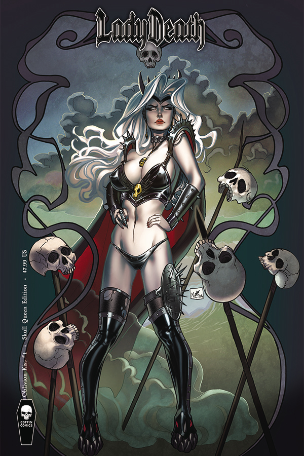 To save her beloved steed Vassago from eternal torment, Lady Death is drawn the wasteland City Siduri where lust isn't a sin, it is a way of life. Instead she encounters the demon sorceress Demonika, is put under an ironclad spell and made to be a plaything to be auctioned off to the highest demon bidder. Is all hope lost? C'mon, it's Lady Death! Lady Death: Oblivion Kiss #1 is a 48-page all-new square bound graphic novel that builds on the mythology creator Brian Pulido has began in Chaos Rules #1, Damnation Game #1, and Oblivion Kiss #1.