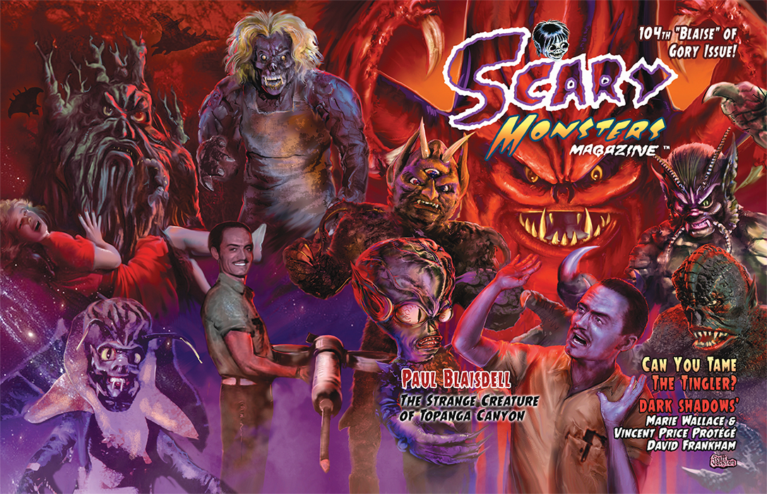 In #104 we highlight the quintessential creator of monsters for B movies in the 1950s. Paul Blaisdell was a one-of-a-kind monster maker who literally stepped inside his own creations, bringing them to life before the cameras and movie-goers worldwide. We also ask, "Can You Tame the Tingler?" in a review of the William Castle-Vincent Price shock-fest from a scientific perspective. Then there's our music-monster mash up with "Gravesy Gravesum's American Chop 40 Monster Hits Edition." Godzilla fans will appreciate a convenient guide to the 29 G films released by Toho. We also visit with Dark Shadows alumna Marie Wallace and Vincent Price protégé David Frankham of Return of the Fly, Tales of Terror, The Outer Limits, and Star Trek. And there's much, much more in 144 vintage pulp pages for Monster Kids of all ages!