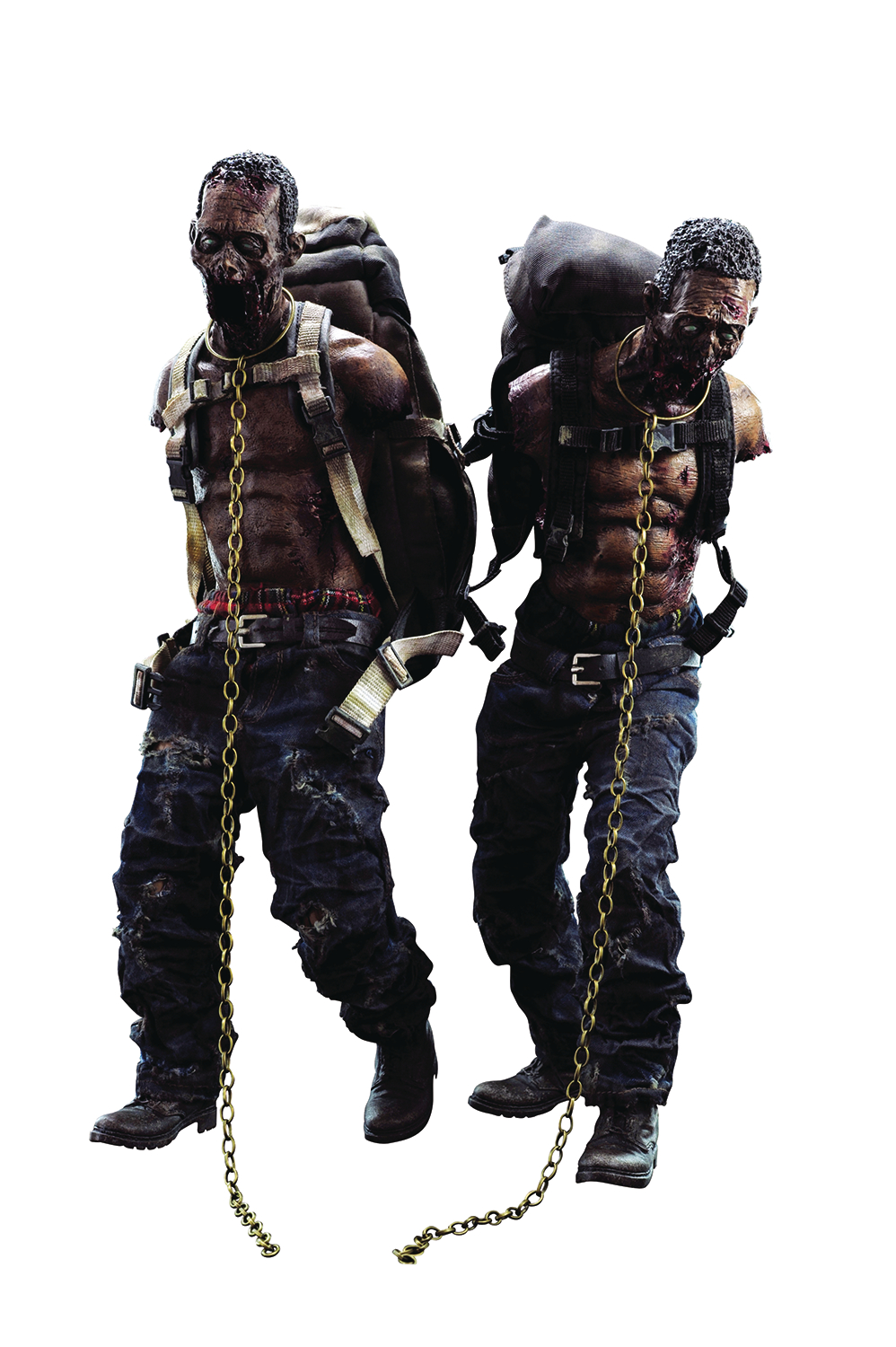 Walking Dead comes a set featuring both of Michonne's zombie pets! The realistic soft simulated skin gives a seamless appearance, and the details on the fleshy wounds and fabric texture of the bags and jeans are all of top quality, creating a faithful rendition from the series! Both figures stand approximately 11" in height and are fully articulated allowing for all sorts of poses.