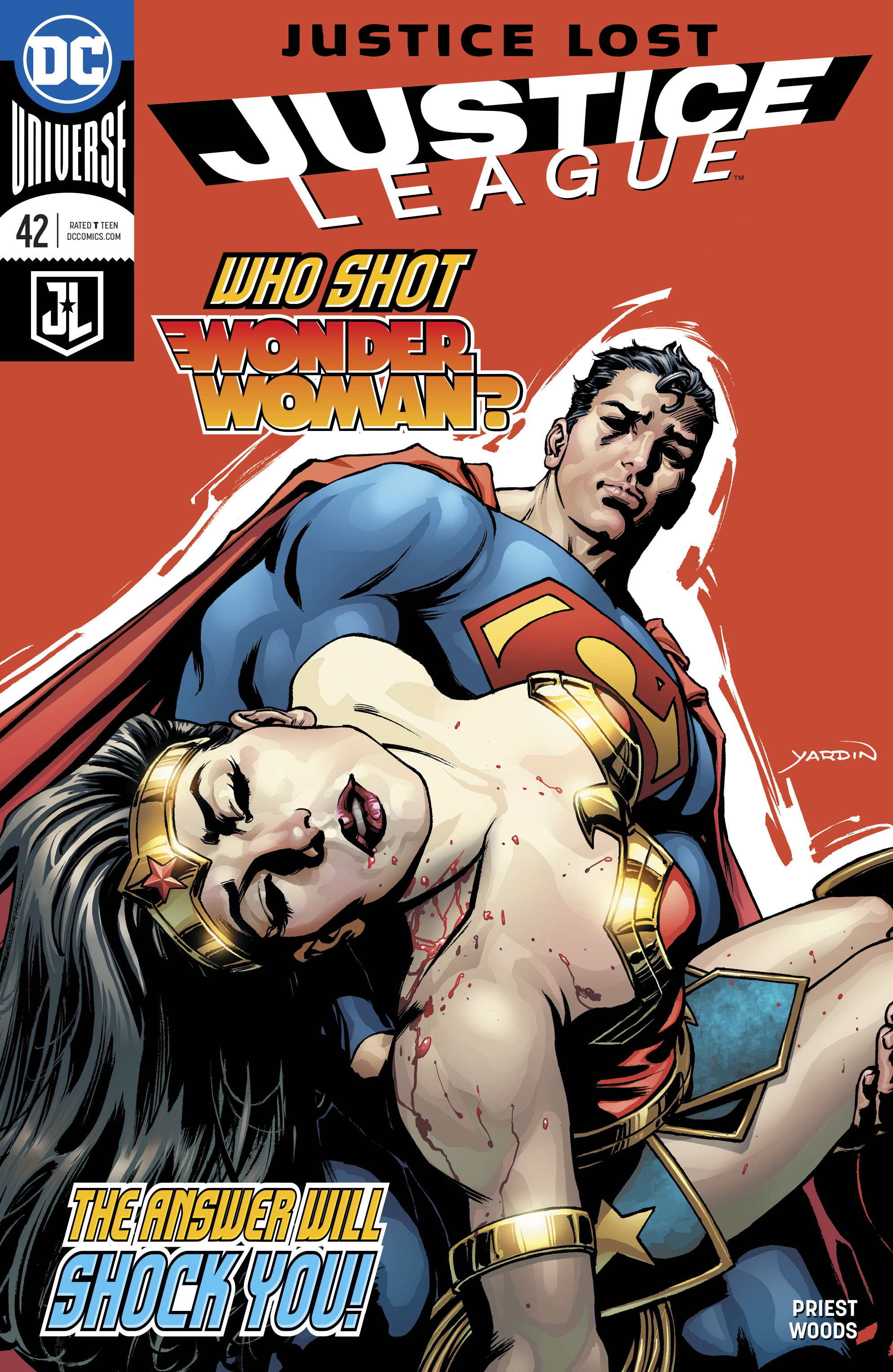 "JUSTICE LOST" part two! Trapped in the chaos of tribal conflict, the Justice League becomes divided over whether to intervene in a civil war in order to protect thousands of fleeing refugees-and a crucial decision could have dire consequences for one of their members! Meanwhile, Batman and Aquaman clash over how to take down the nemesis known only as the Fan, who holds all of their secrets hostage.