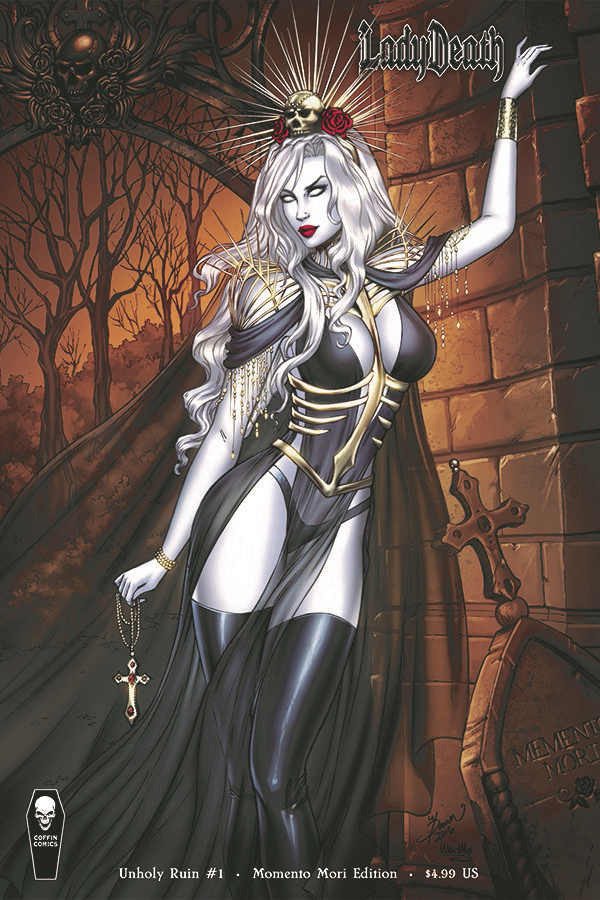 New Story! New Format! News that her beloved mother Marion is being held captive leads Lady Death straight into Gore Galore, a horrific, twisted reality show televised throughout Hell that pits the diva of death against hordes of cannibal serial killers, supernatural slashers, even former allies. It's a suicide trap masterminded by the Hellbourne Elders to wipe Lady Death off the face of Hell! Can Lady Death prevail and be reunited with her mother? Meanwhile, Hellwitch and her Hellbourne army descend to exact revenge! Featuring the return of a beloved character, the introduction of Mr. Atticus Marrow and re-introducing War Angel!