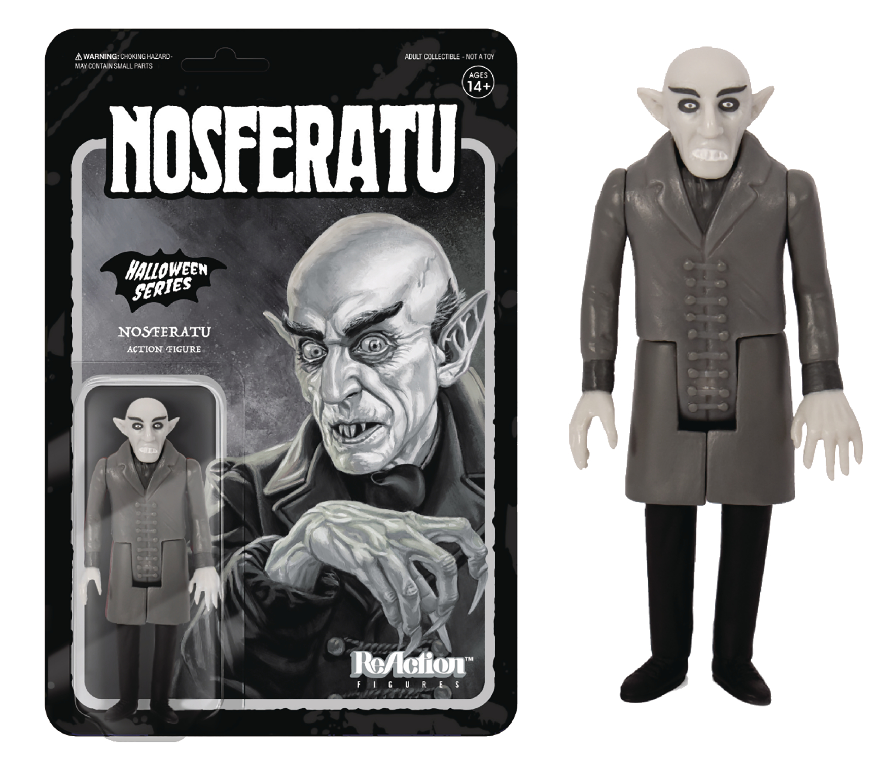 The doomed Count Orlok (Nosferatu) emerges from the mists of horror films past to walk among us again! This limited run Nosferatu 3 3/4" figure comes in eerie grayscale with matching grayscale cardback.