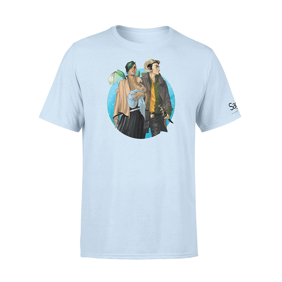 This T-shirt features the cover of the first issue of BRIAN K. VAUGHAN and FIONA STAPLES' SAGA. Sleek and simple on an ice blue background. T-shirt fits true to size.