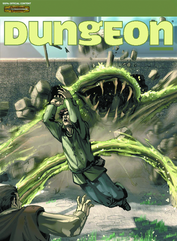 Dungeon is the premiere magazine for Dungeon Masters! The Savage Tide Adventure Path continues with "Serpents of Scuttlecove," sending the PCs to an infamous city where the police are cannibals and the streets ruled by murderers and monsters. This adventure is supported by a backdrop article and a four-panel poster map of the pirate city of Scuttlecove. In "Spawn of Sehan," the second installment of the "Servants of Sahan" three-part campaign arc, the PCs confront a sinister sect of deformed cultists. All this plus a new low-level adventure, Dungeoncraft, Downer, and Mt. Zogon!
