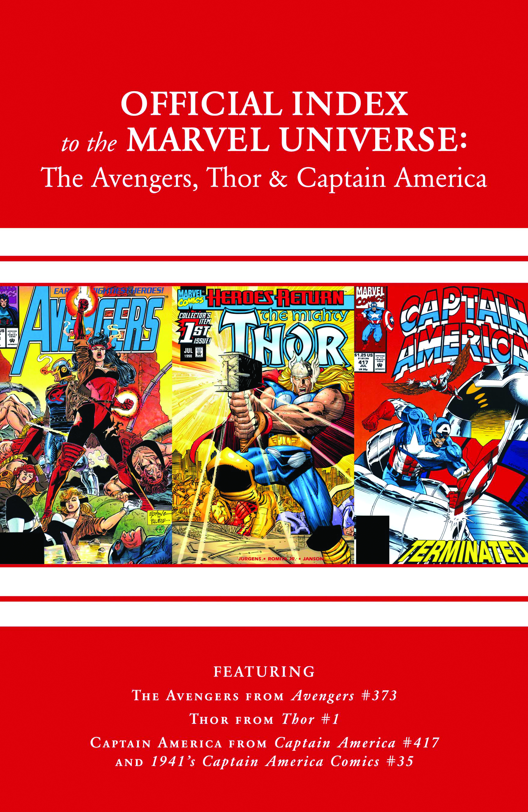 Return with us to the Silver and Golden Ages as the chronicle of the Marvel Universe continues its coverage of the Avengers (from AVENGERS #373), Thor (from 1998's THOR #1), and Captain America (from both CAPTAIN AMERICA #417 and 1944's CAPTAIN AMERICA COMICS #35). Watch the Marvel universe's history unfold month by month as we provide synopses for dozens of individual comics, including back-up strips - introducing the characters, teams, places and equipment that appeared within with vital information about first appearances, where they last showed up and where they appeared next!