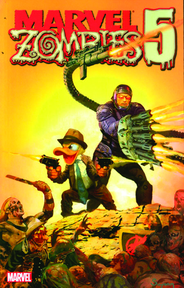 Zombies on Infinite Earths! The zombie plague has been largely wiped out and the Earth spared from an undead apocalypse. But a cure to the virulent infection still proves elusive, due to the disease's ever-changing nature. To uncover an antidote, Machine Man and Howard the Duck have set out across the multiverse, in search of zombie samples to bring back to their laboratory base. Joining forces with the gunfighter known as Jacali Kane, they must travel to five distinct universes beset by their own unique zombie plagues. A universe stuck in the Wild West. A world overrun with malicious Martians. A land where Camelot is at its height. A cybernetic future megacity. And the world we call our own. Can Machine Man, Howard the Duck and Jacali Kane obtain the samples they need from each of these worlds?without becoming zombies themselves? Collecting MARVEL ZOMBIES 5 #1-5.