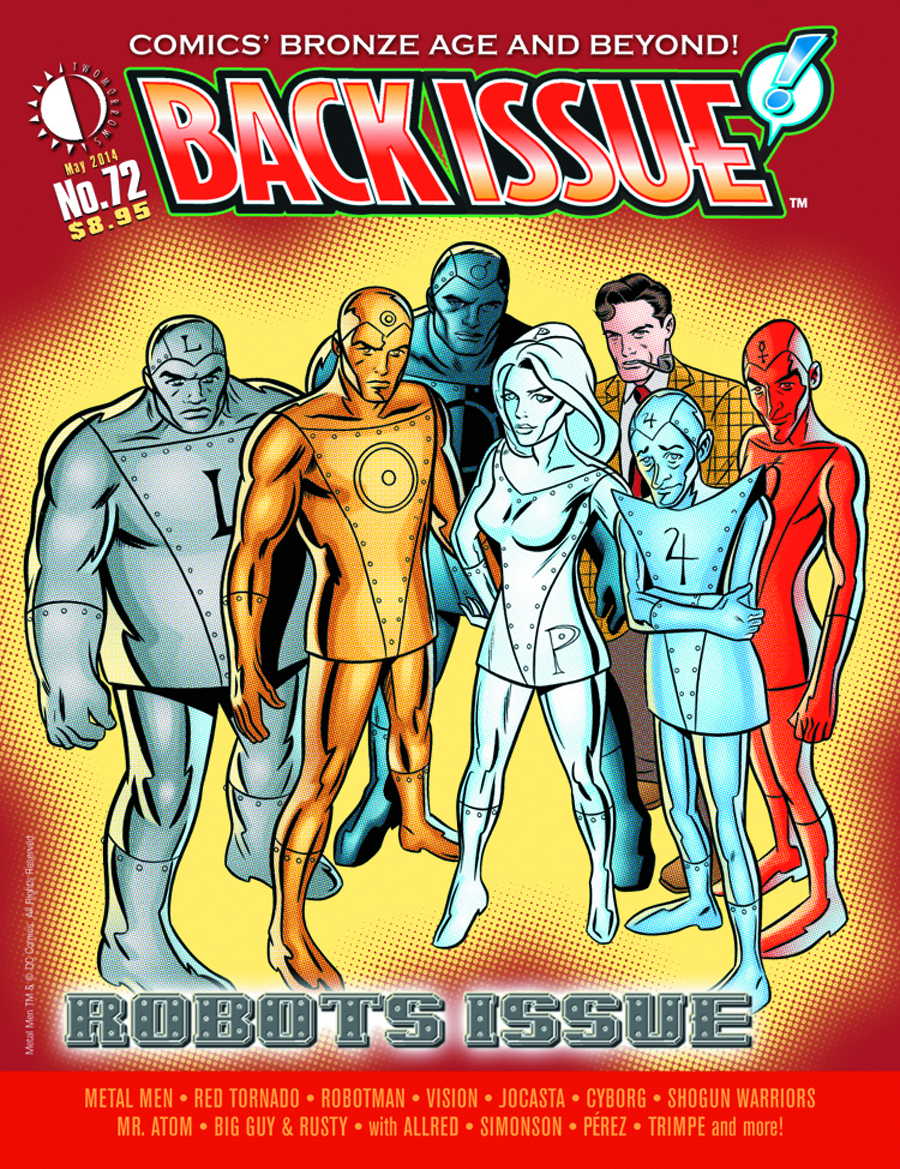 Back-Issue presents a shiny new "Robots" issue, unbolting the stories behind '70s and '80s favorites Cyborg, Metal Men, Robotman, Red Tornado, Mister Atom, the Vision, Jocasta, Shogun Warriors, and Big Guy and Rusty the Boy Robot! Plus: the legacy of Brainiac! Featuring the riveting work of Geof Darrow, Steve Gerber, Carmine Infantino, Paul Kupperberg, Frank Miller, Doug Moench, George Perez, Walter Simonson, Joe Staton, Roy Thomas, Marv Wolfman, and more, behind a