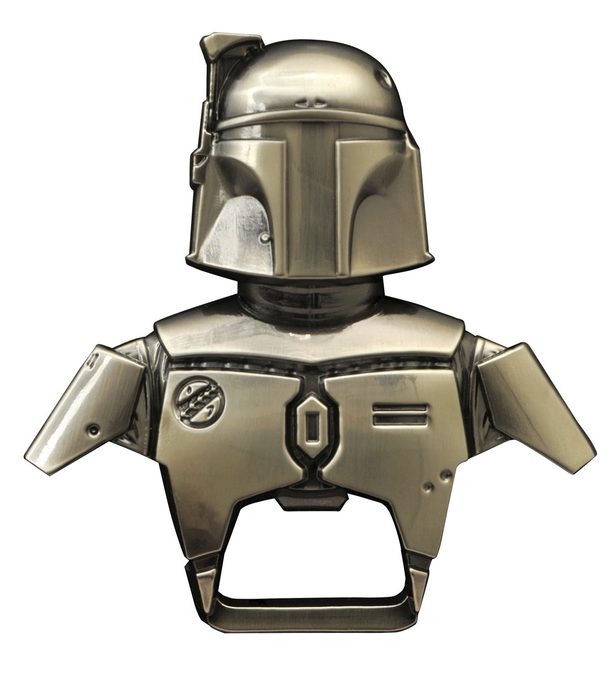 A Diamond Select Toys Release! Boba Fett? Where? On your brand-new bottle opener, that's where! Make sure you always have a way to open tasty beverages with this solid metal bottle opener, depicting the portrait of Boba Fett, super-cool bounty hunter extraordinaire! It measures 4 inches long, has magnets on the back and removes bottle caps like Boba Fett captures a bounty -- with style! Comes packaged in a collector's slip case with a full-color wrap.