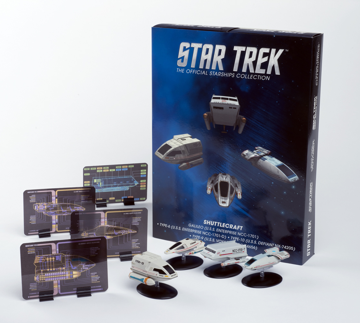 The long-awaited set of Shuttlecraft! Includes U.S.S. Defiant NX-742056 Shuttle Type 10, U.S.S. Enterprise NCC-1701 Shuttle Galilée, U.S.S. Voyager NCC-74656 Shuttle Type 9, and U.S.S. Enterprise NCC-1701-D Shuttle Type 6.