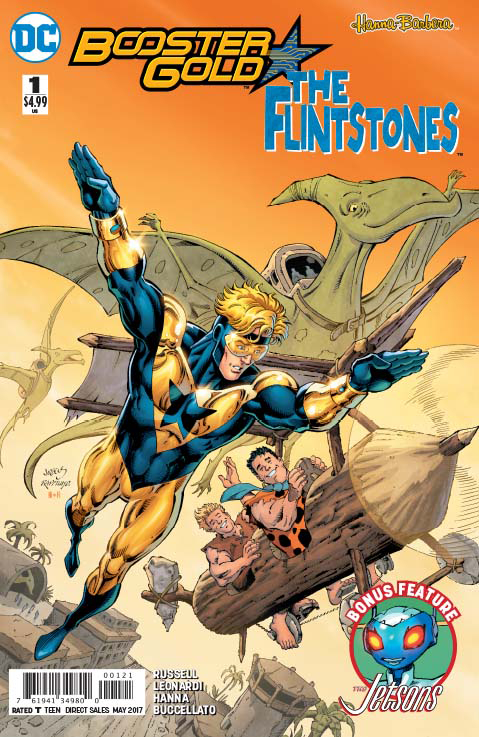 Welcome to the 25th century, where the Earth is a polluted post-industrial nightmare, most animals are extinct, and reptilian aliens are invading cities across the planet! In their time of need, the world's citizens turn to the time-traveling Booster Gold to save the day. To learn why these aliens are seeking revenge, Booster dives deep into the prehistoric past to see what happened the last time they hit the planet. In this bygone era, Fred Flintstone and Barney Rubble must help Booster learn the truth and return to his own time armed with the information that will bring down the invaders - if Booster can convince them to help him. No problem - we all know how persuasive Booster can be, right? Right?! And in the backup feature starring The Jetsons, in a new twist on an old twist about our future, The Jetsons live in a world of robotics and gadgetry. But how does dying change when grandma's brain can be digitally imprinted onto a housecleaning robot?
