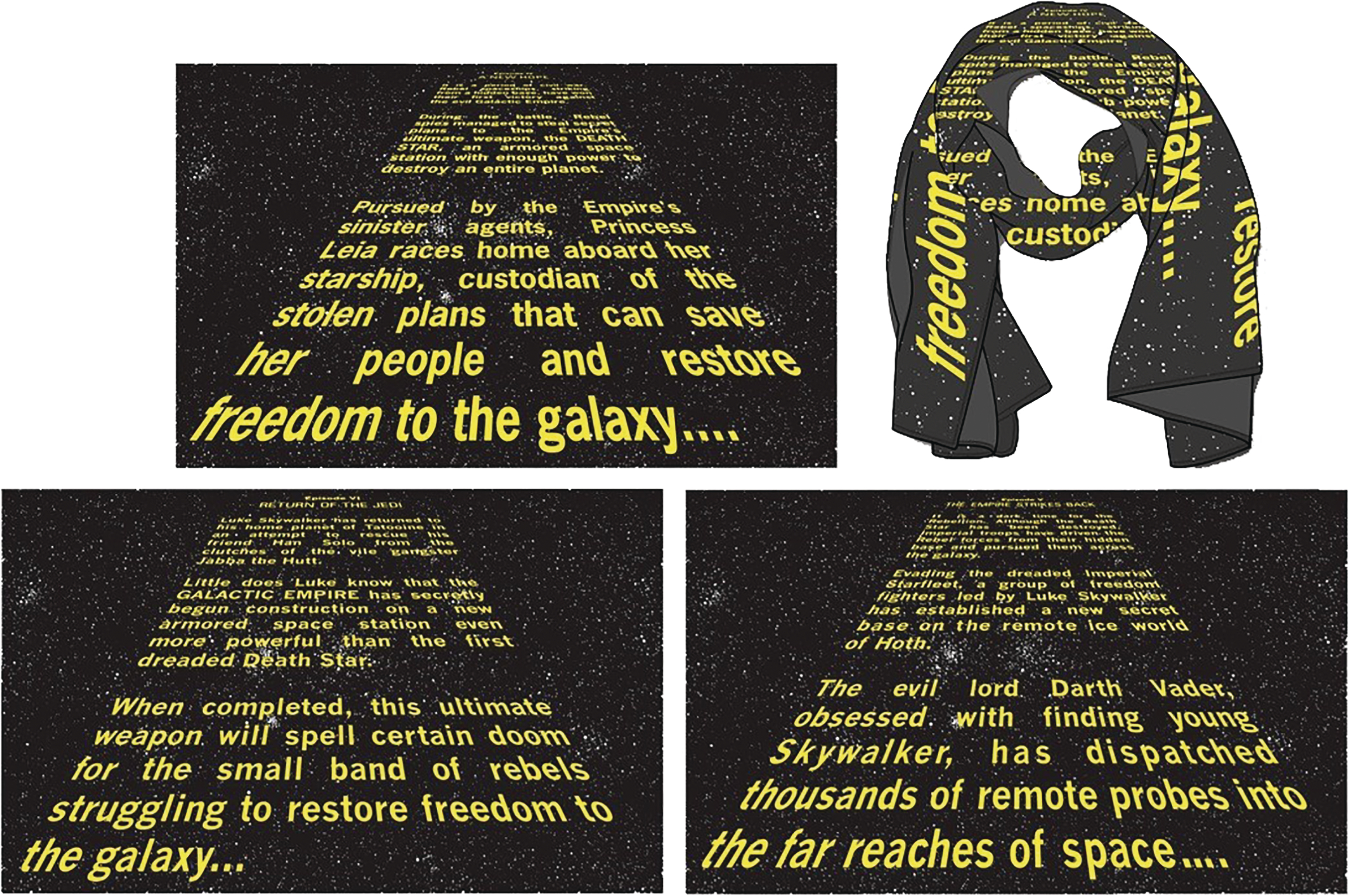 A PREVIEWS Exclusive! The legendary opening crawls to the Star Wars films are recreated on these scarves! Choose from The Empire Strikes Back or Return of the Jedi.