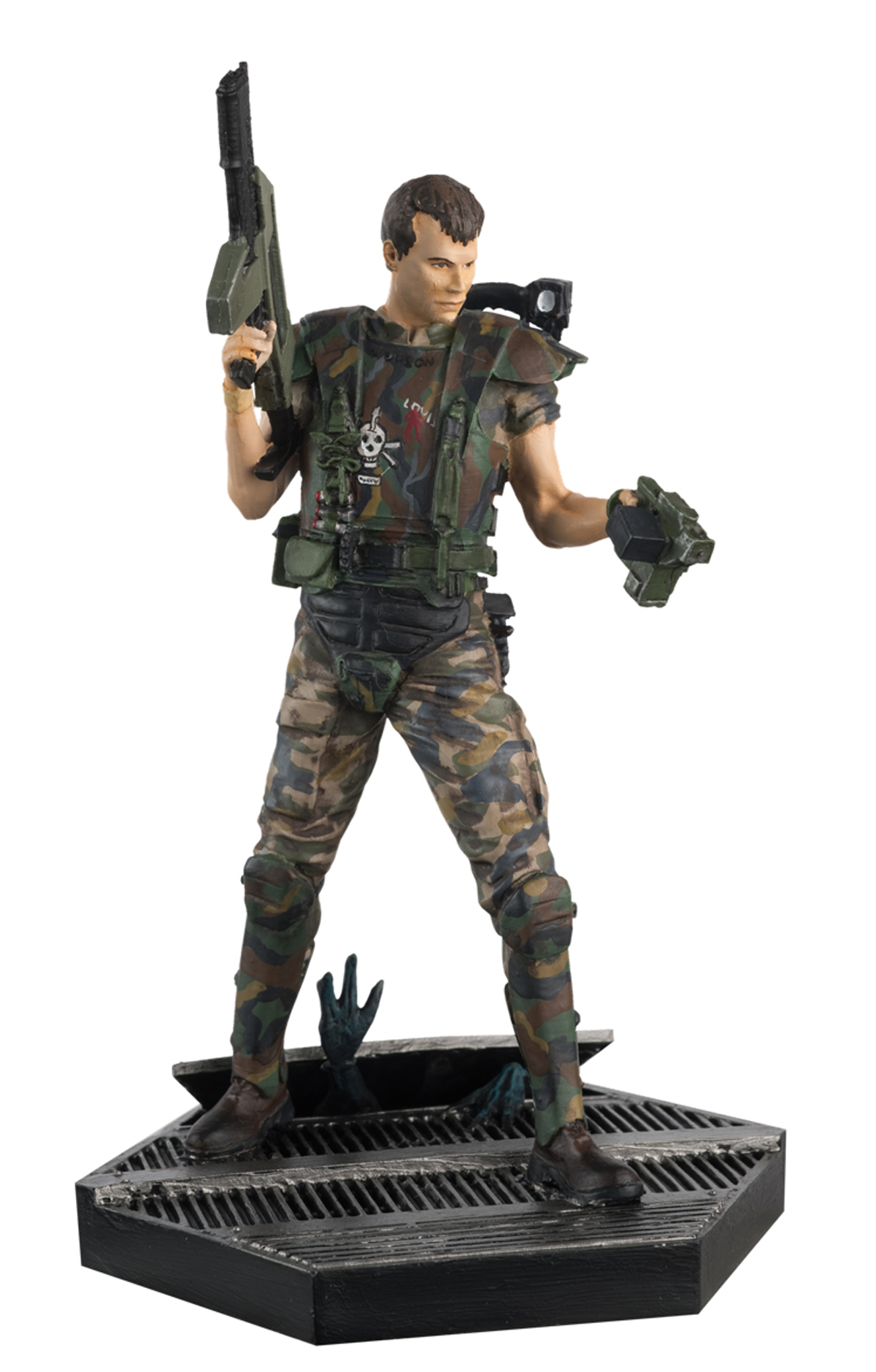Private First Class William L. Hudson is one of the Colonial Marines sent to investigate the loss of communication with a terraforming colony on LV-426 in James Cameron's Aliens. A joker in Bravo Team's pack, Hudson cracks under the pressure of the first xenomorph attack but hardens into an excellent soldier when his team is making their last stand. The figurine, featuring Hudson armed with his motion tracker and pulse rifle, is inspired by his final moments.