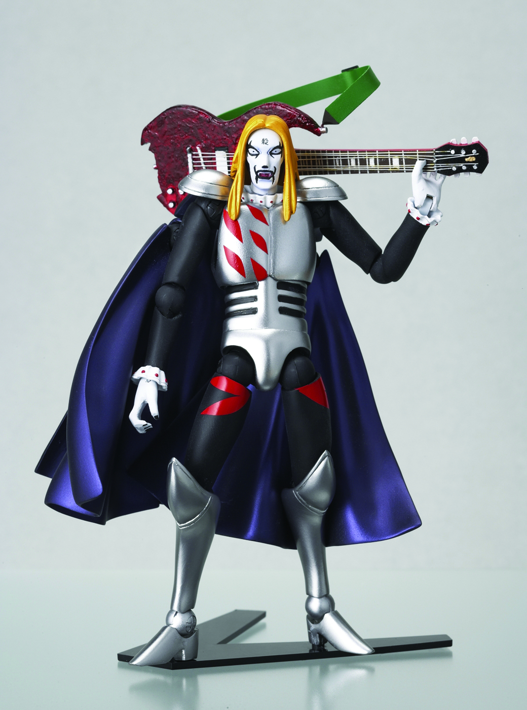 Detroit Metal City, taking the stage name "Johannes Krauser II." In his heavy makeup, Negishi took on a completely different persona, shouting the most vulgar profanities beyond anyone's imagination. The three band members of Detroit Metal City have been turned into the latest figures in the Revoltech Joint action figure line, featuring an innovative joint system that allows figure to demonstrate any kind of realistic pose. The three characters -