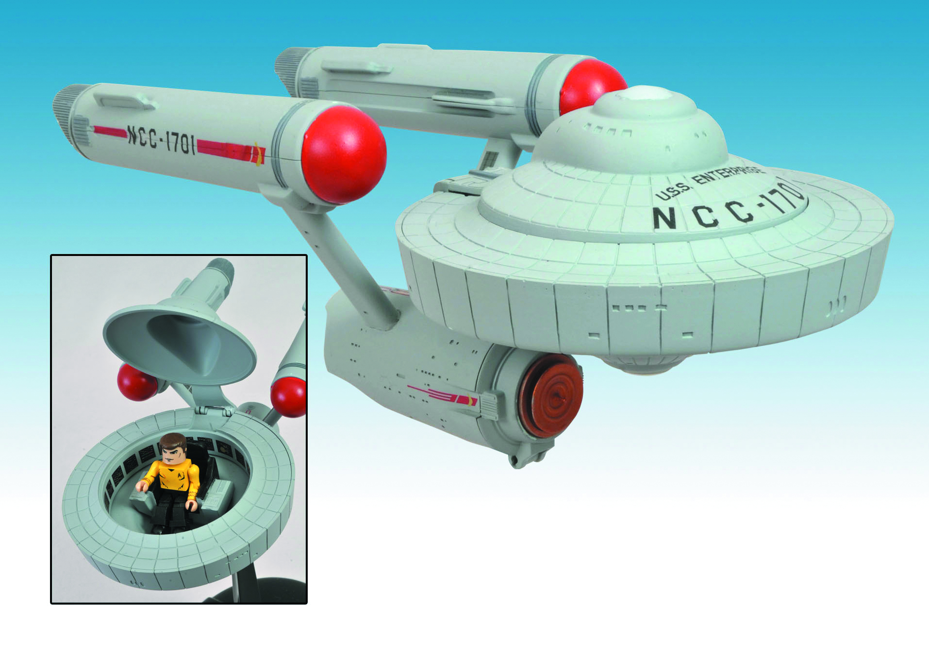 A Diamond Select Release! Designed and Sculpted by Art Asylum! Star Trek Minimates return! After a long absence, DST is bringing back Trek Minimates with their most spectacular Minimates vehicle yet -- the starship Enterprise! With an opening cockpit and a hidden Jeffries tube in the engineering section, the ship measures 10 inches long and includes an exclusive Minimate of Captain Kirk.