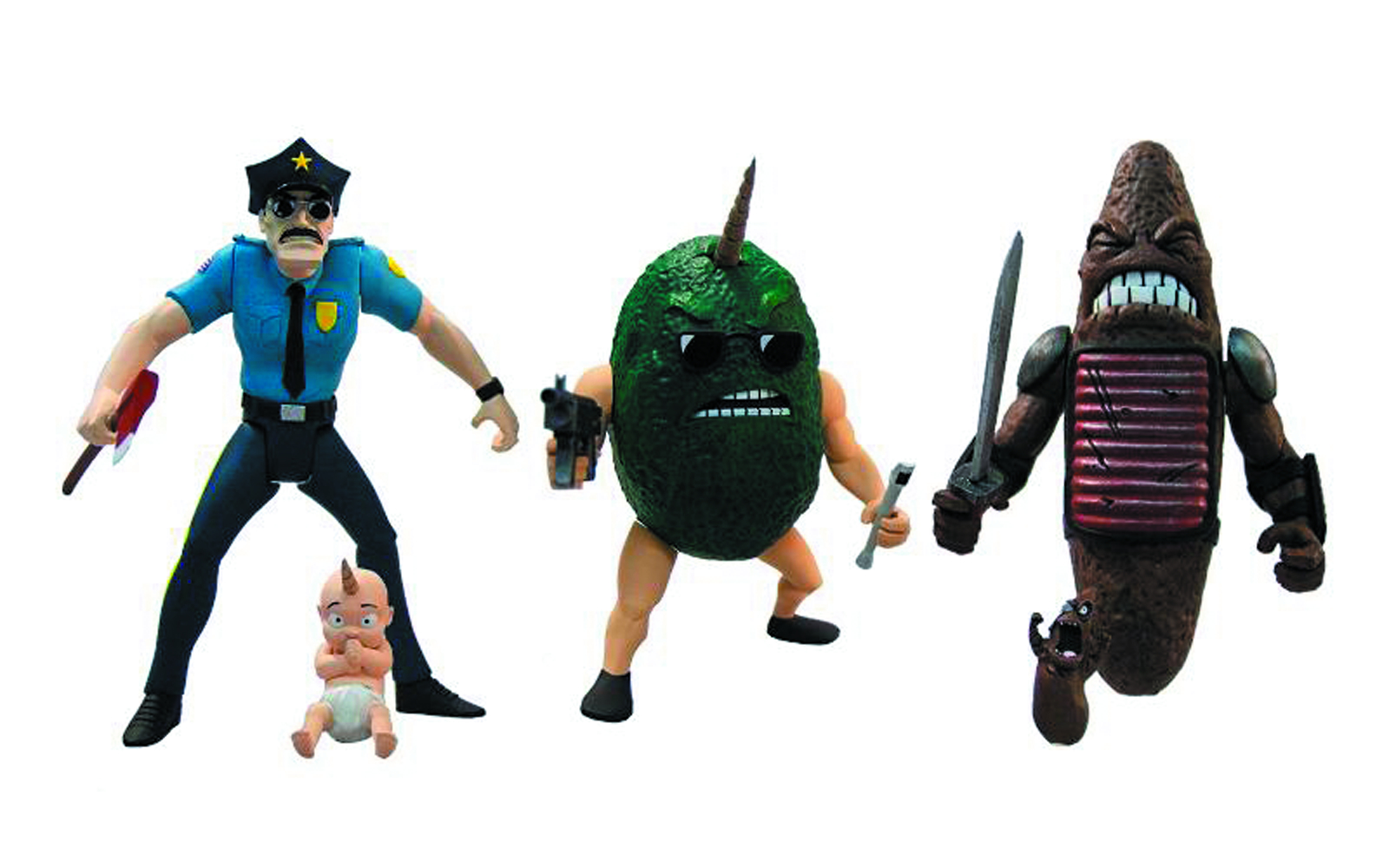 Avocado Soldier (with flute, machine gun, and removable unicorn horn). Blister card packaging.