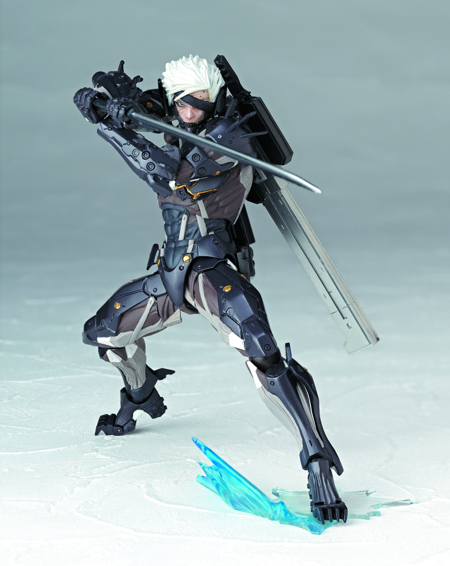 Metal Gear Rising: Revengeance stands 5 3/4" tall and comes with optional hand, visor, and eyeball parts as well as high-frequency blade, knife, arm mounts, leg supporters. The figure features multiple points of articulation and a display stand. Window box packaging.
