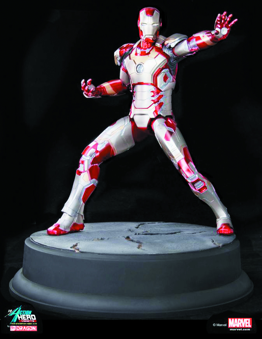 Iron Man 3. The latest and most advanced armor from Stark Industries is the Mark XLII and is made of separate suit pieces that can individually attach itself to the wearer and re-form as a whole suit around the body. There are several noticable differences in the Mark XLII from the previous Iron Man armors, and we are able to accurately replicate the new sleeker look and color scheme. Working with official Marvel 3D data, and applying our own in-house techniques, Dragon Models' Iron Man Mark XLII Action Hero Vignette is highly accurate and detailed.