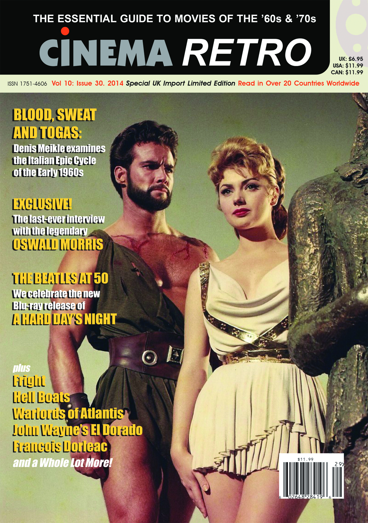 Cinema Retro closes out 2014 with its 30th issue and celebrates 10 years in print with a packed publication featuring all genres of cinema: War, Western, Sword & Sandal, Music, Horror, and Adventure! Our exclusive interview this issue is with the legendary cinematographer Oswald Morris, who passed away earlier this year. This was his last-ever interview. Films covered, include the fantasy adventure