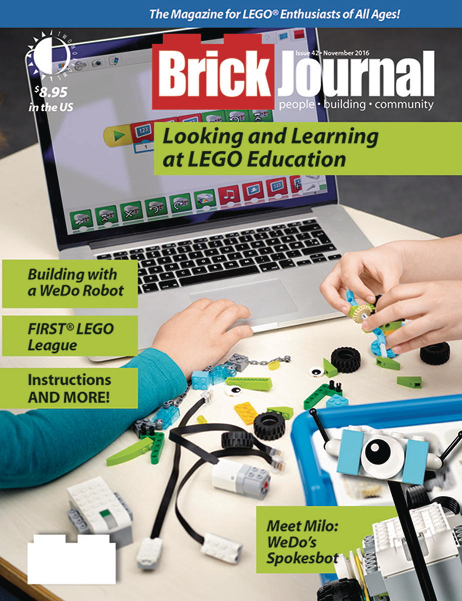 Editor Joe Meno takes a look and reviews the new WeDo to see how both schools and AFOLs can build with it. First LEGO League's 2016 season will also be explored, with a feature on a school that sent two teams to national competitions in LEGOLAND California and First Championships in St. Louis! We'll also talk to some great robotics builders, the Seshan Brothers, about the models that have taken LEGO Mindstorms to the next level! Plus: AFOLs ("Adult Fans of LEGO") by cartoonist Greg Hyland, step-by step "You Can Build It" instructions by Christopher Deck, Mindstorms robotics lessons by Damien Kee, and more!