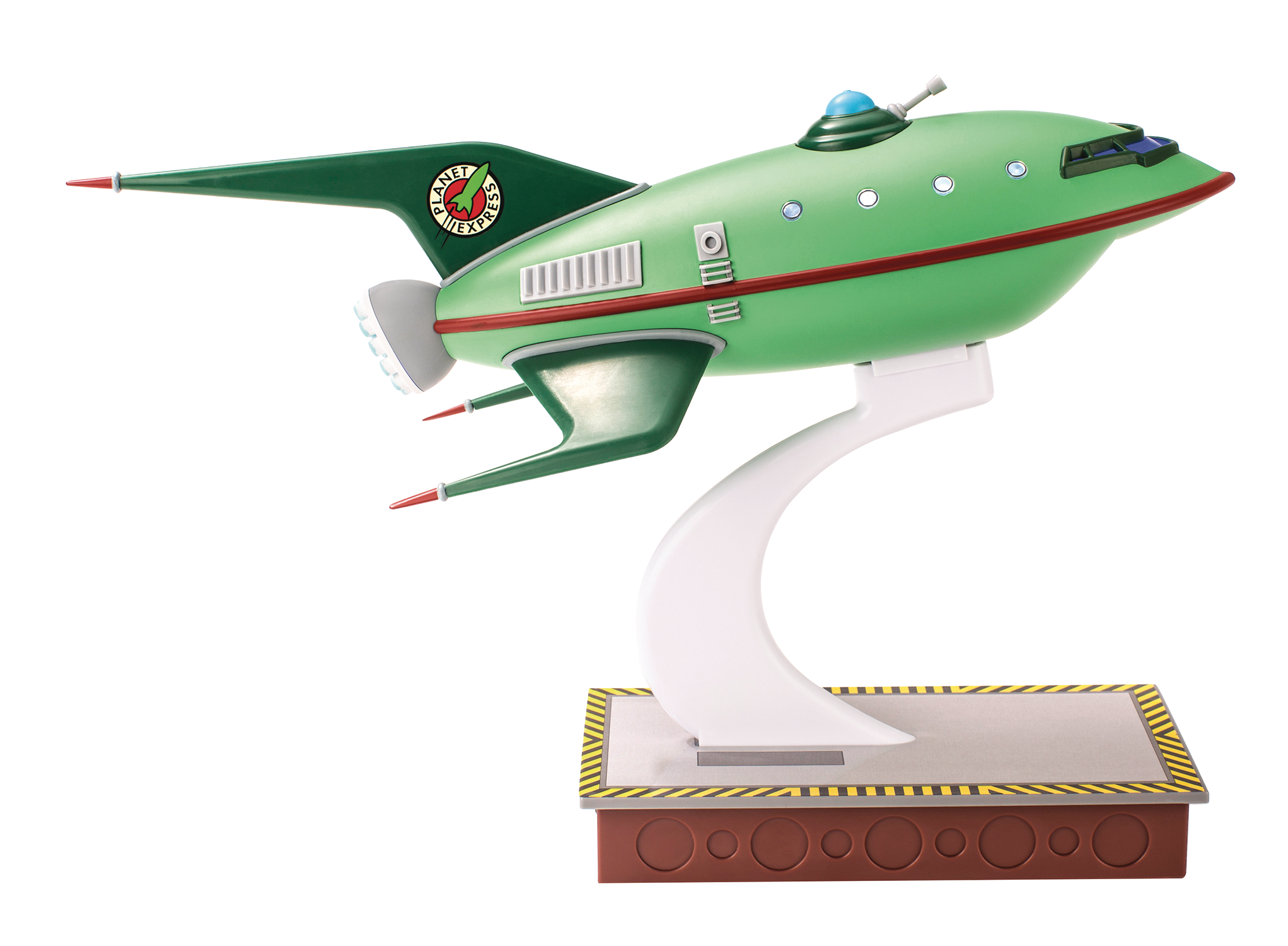Futurama follows 20th century pizza guy Philip J. Fry and his eccentric new friends in the 31st century. One thousand years from now the crew of Planet Express travels to the ends of the galaxy delivering packages and having zany adventures. This Planet Express Ship Master Series vehicle replica is an authentic re-creation of the ship as seen on the show. It lights up in the cockpit, portholes and exhaust and operates on three AAA batteries (included). The ship has the unique QMx magnetic base and comes off and goes on the stand with ease. Re-live the fun of