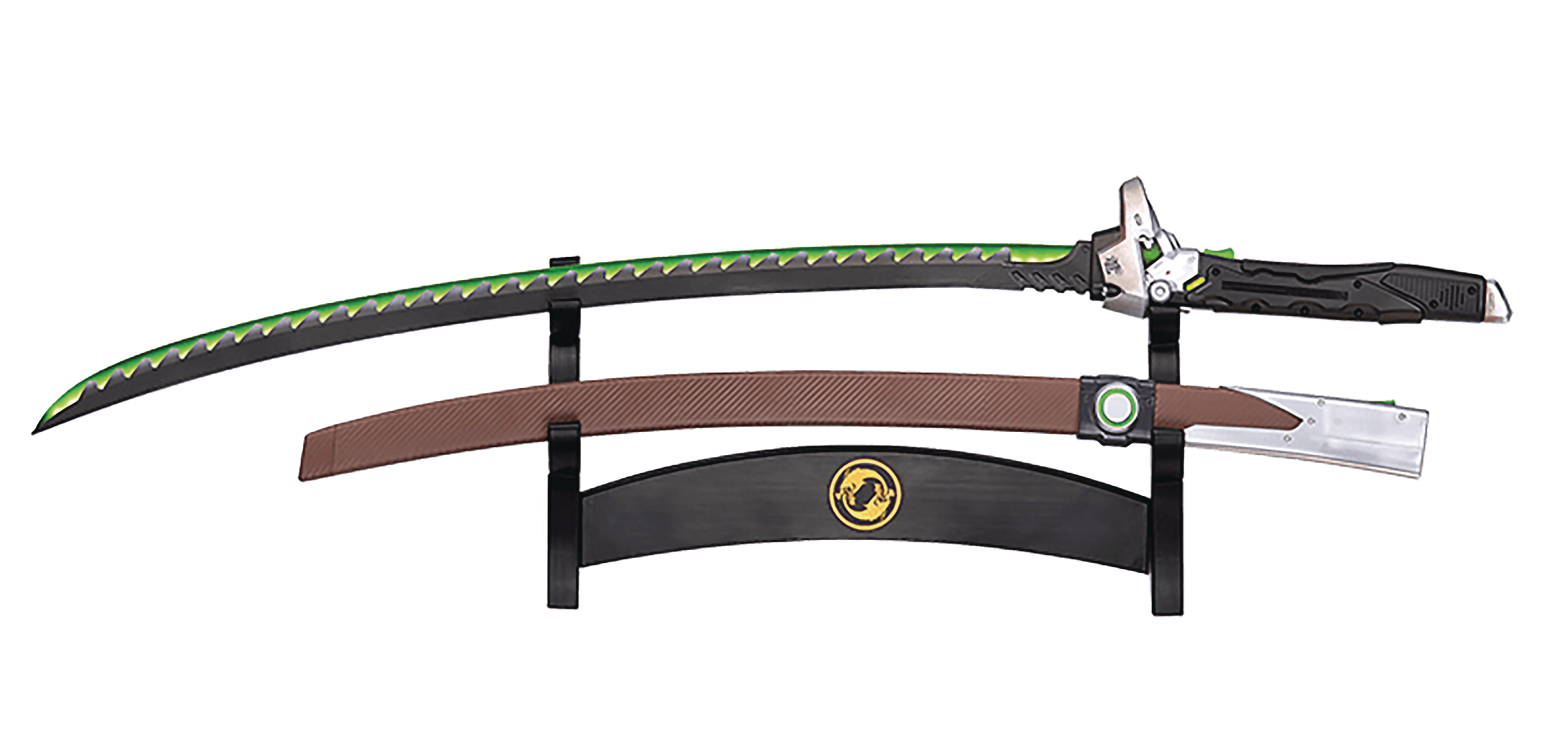 Overwatch to wander the world. Even he cannot say where his path will lead.This Replica Sword measures 48" x 5" with 1/2" blade. The stand measures 20" x 10.5" x 6.25". Made of PVC, ABS, alloy and electronic chips. Also included are 1 sword sheathe and 1 stand. Sword contains off/on switch to enable light-up features and creates sound upon motion activation. Button on sword handle triggers authentic SFC based on Genji's Ultimate ability. The sword weighs 2.9lbs, the sheathe weighs .8lbs and the stand weighs 1lb. Includes 3 AA batteries (1.5V). For ages 15+, this is not a toy.