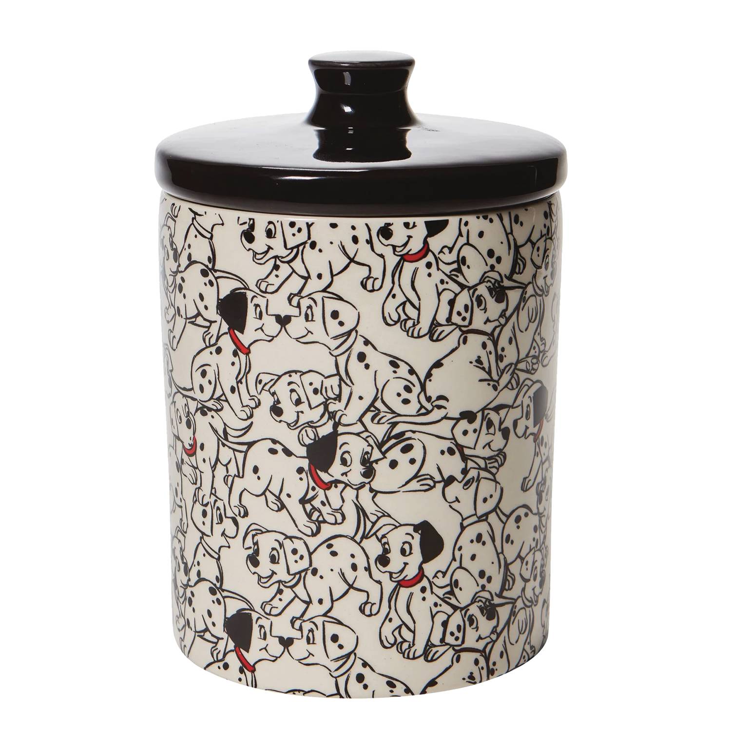 One Hundred and One Dalmatians with this food safe and sturdy stoneware canister perfect for pet and human treats alike. Decorated with a pack of dalmatian puppies all around the canister. Cookie jar measures 7 1/4'' H x 4 3/4'' Diameter.