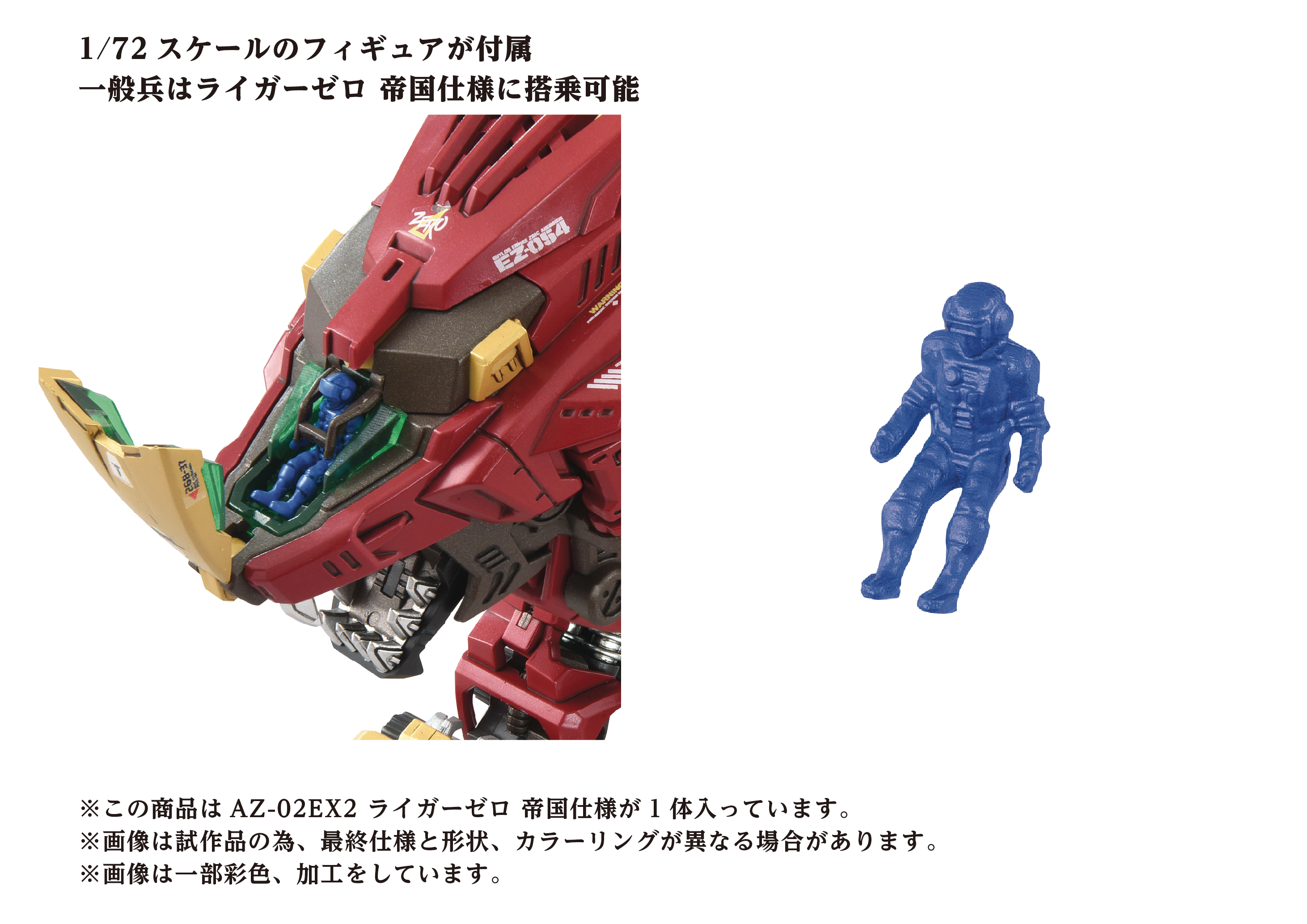 AZ-02EX2 LIGER ZERO to life. By activating the built-in electric unit, the model reproduces a realistic walking motion, with LED lights illuminating the eyes and chest for added presence. The kit also includes several manually operable features, such as fairings, downforce stabilizers, and ion turbo boosters mounted on the back. The Zero Armor can be removed to reveal its "base body" state, adding another layer of display variety. A 1/72 scale pilot figure (unpainted) is included and can be seated inside the cockpit. For display, the kit comes with a dedicated base that allows you to watch the Zoid walk in place. Requires 2 AAA alkaline batteries (sold separately).