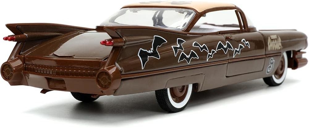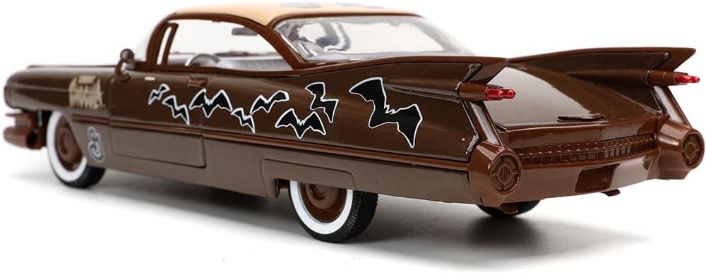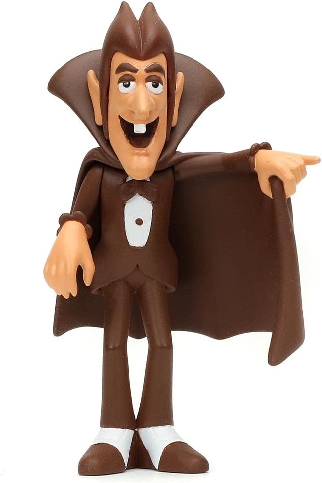From Jada Toys. Cruise along with your favorite cheerful, chocoholic monster! This 1959 Cadillac Coupe DeVille takes styling cues directly from General Mill's Count Chocula cereal. This 1:24 scale chocolatey vehicle features a die-cast metal body and graphics on the roof! A die-cast metal Count Chocula figure is also included.