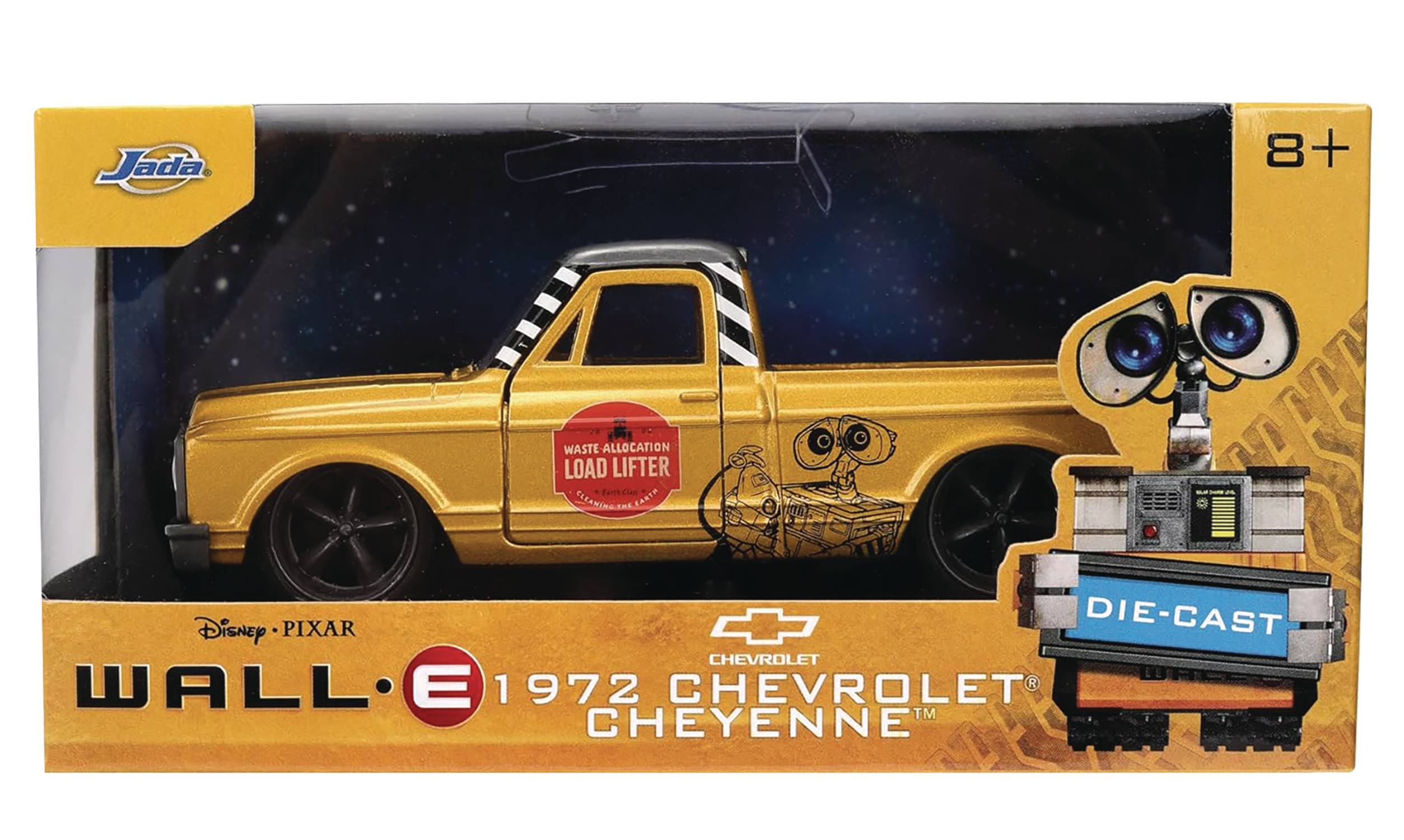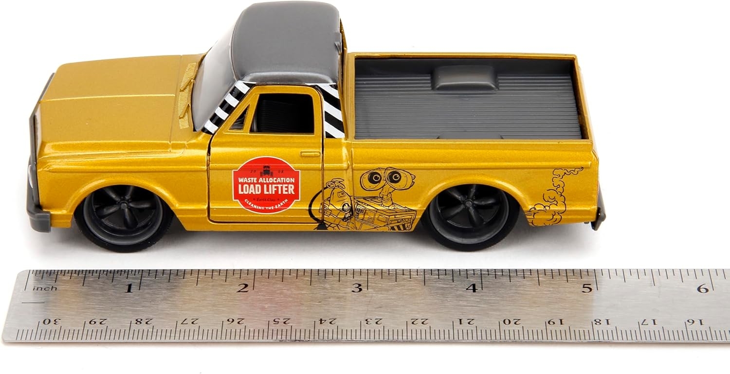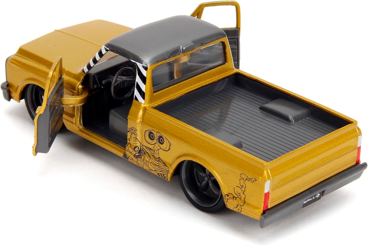 From Jada Toys. Featuring the 1972 Chevrolet Cheyenne with Wall-E-themed graphics, this 1:32 scale die-cast model is a must-have for fans of Pixar's beloved robot. Made with a 100% die-cast metal body, this collectible vehicle guarantees durability and superior craftsmanship, perfect for both play and display. Equipped with opening doors and premium rubber tires, this model offers an authentic look and feel that will excite both collectors and car enthusiasts.