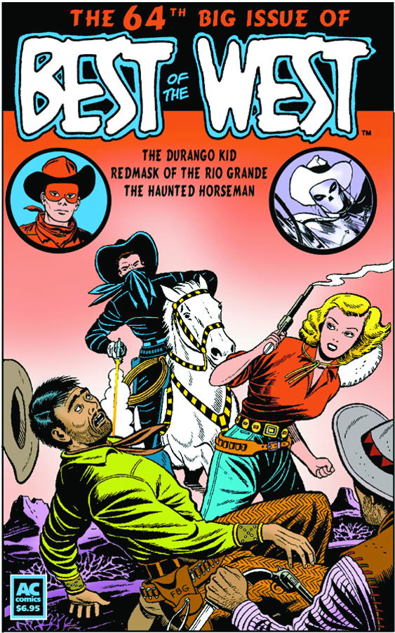 Cowboy heroes ride again in vintage reprints from the best Western comics of the 1950's, featuring adventures of The Durango Kid, Redmask, and The Haunted Horseman. Extra features include "Jesse James" by Joe Kubert, "Black Diamond" by Myron Fass, "Wyatt Earp" by Norman Maurer, and "Kitty Carson" by Bob Powell.