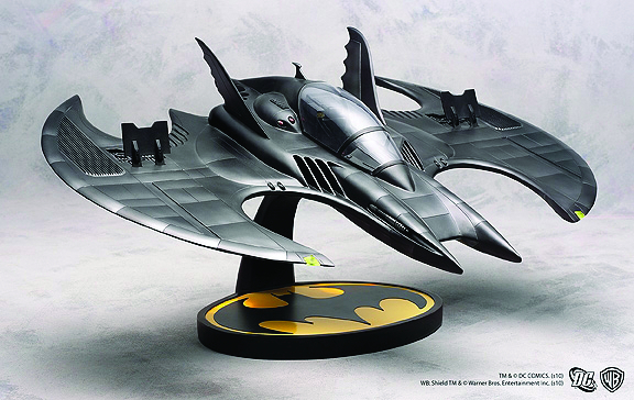 Batwing prop replica includes a handsome Bat-symbol display base. Comes equipped with an electronic LED cockpit, two front LED headlights and 2 amber LED landing lights. The