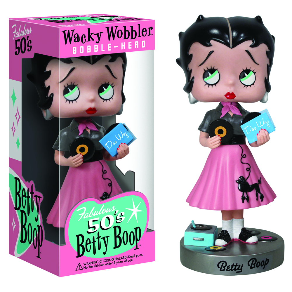 America's favorite animated pin-up girl is brought to life with Funko's new Betty Boop Wacky Wobbler. Based on her look from the 1950s, this bobble stands 6" tall. Window box packaging.
