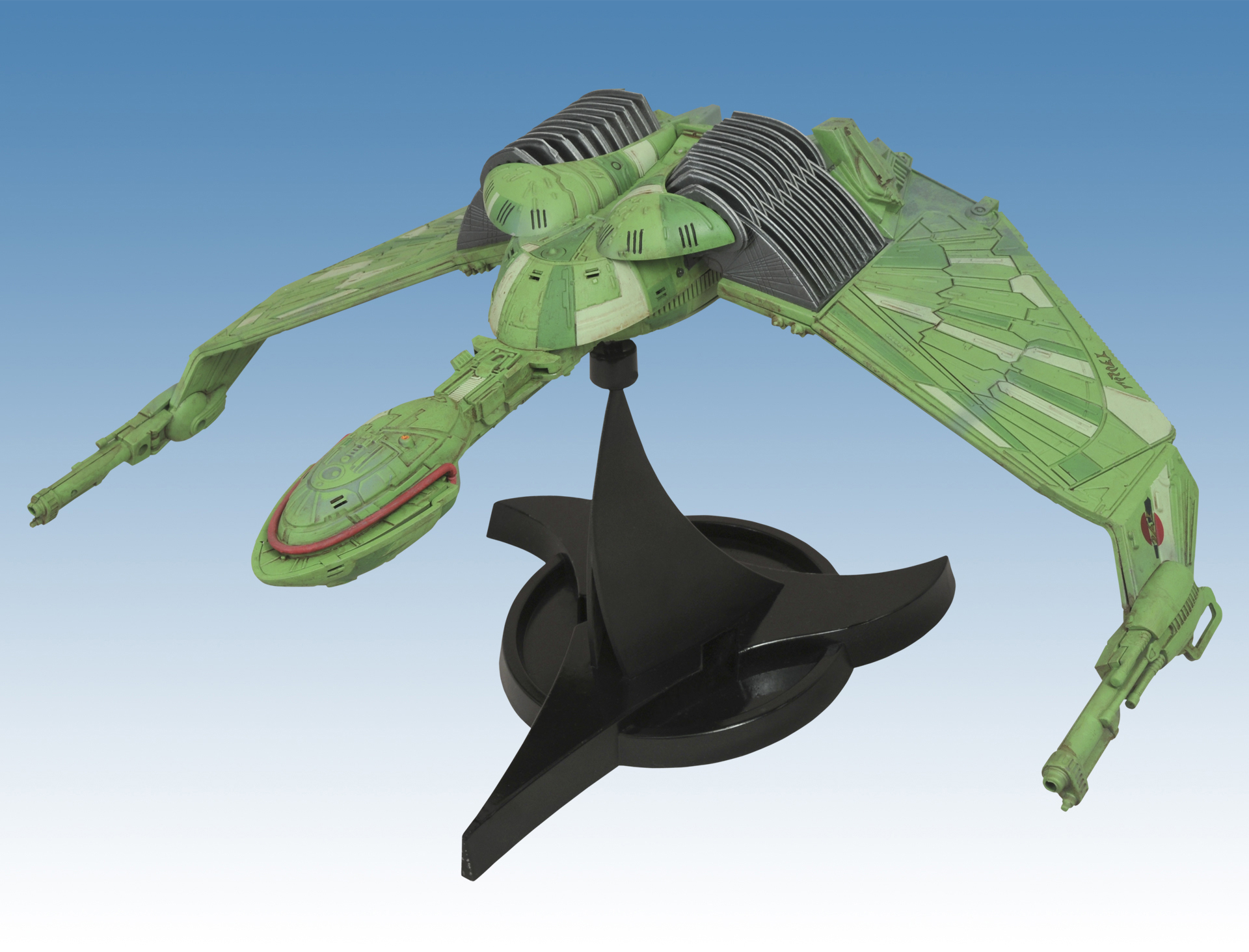 A Diamond Select Release! DST's continuing mission: to bring you cool new electronic Star Trek ships! The Klingon Bird of Prey, as seen in multiple feature films, is their first non-Enterprise ship in the line, and will be the must-have item to complete any Trek fan's fleet! Packaged in a "Try Me" window box so customers can test its movie-accurate lights and sounds, the Bird of Prey measures 12 inches long x 19 inches wide and comes with a display stand.