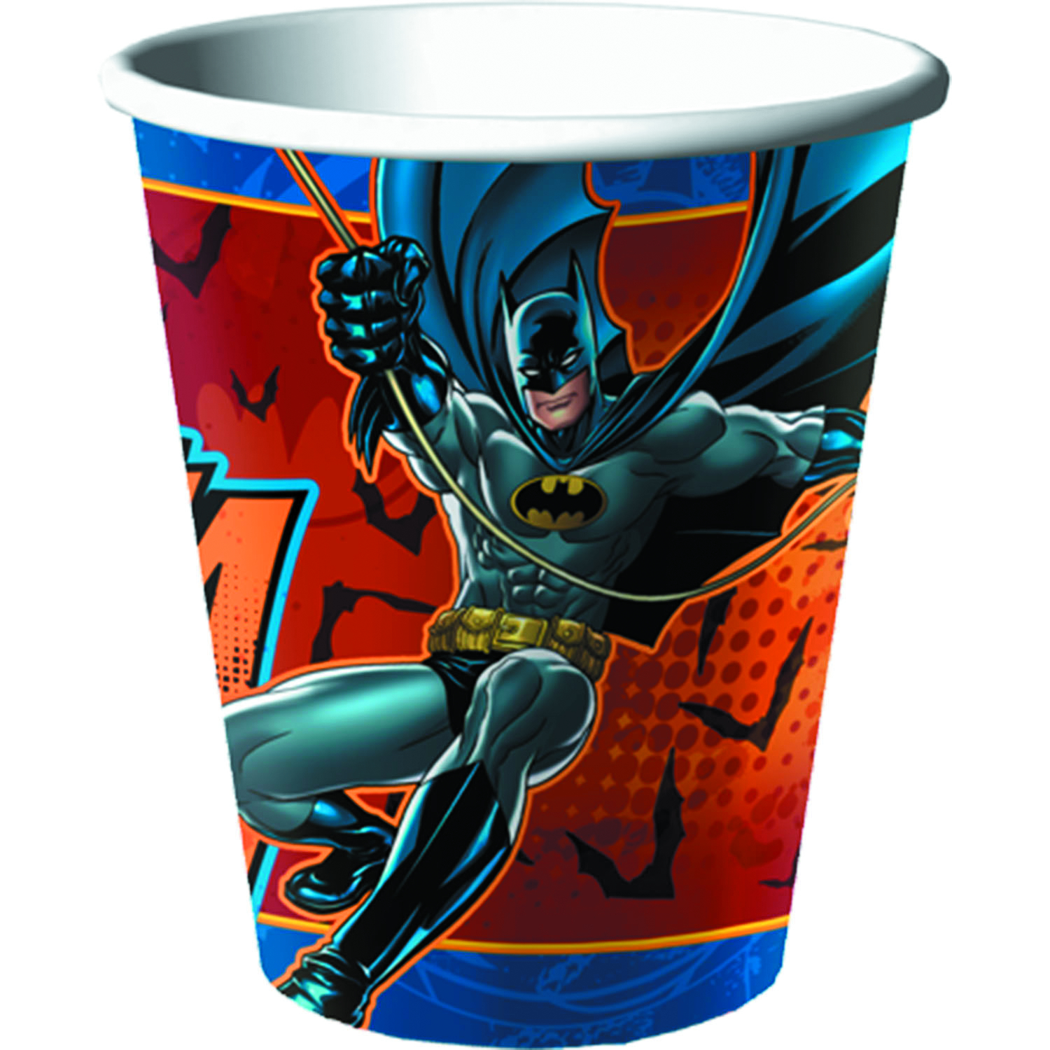 Gotham City's guardian Batman is ready to entertain you and your party guests with Hallmark's Batman Heroes and Villains party supplies! Decorate for the party with Danglers (3 per pack), Confetti, Crepe Streamers (30 feet), and a Table Cloth. Serve your guests with Dessert Plates (8 per pack), Beverage Napkins (16 per pack), and 9-ounce Beverage Cups (8 per pack), then entertain them with the Foam Bat-A-Rangs (4 per pack).