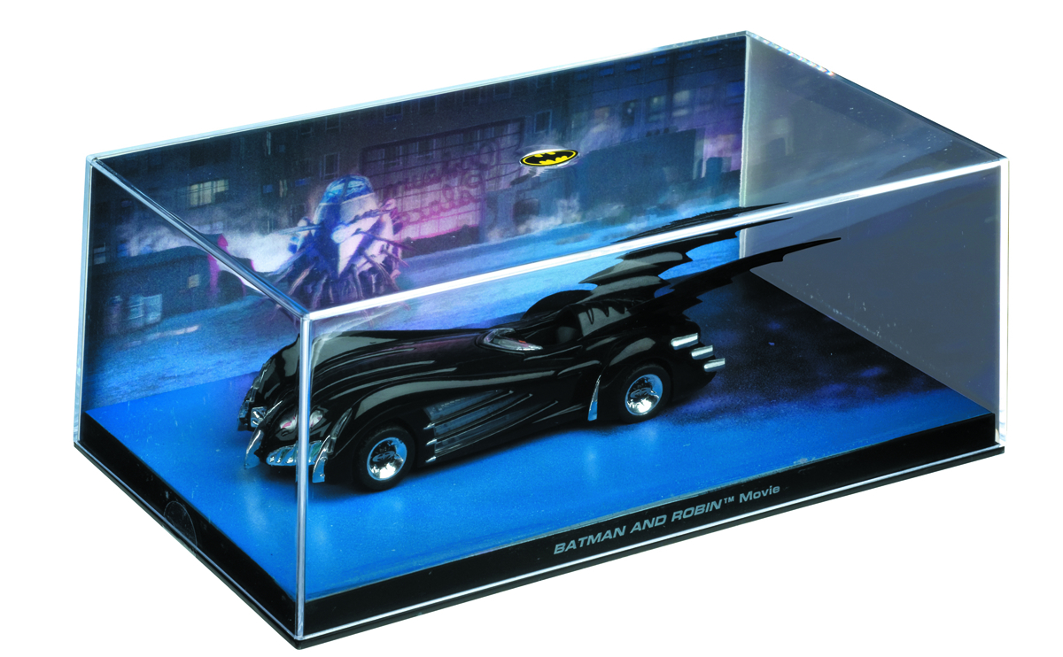 Batman Automobilia Collection gives collectors the most definitive collection of Batman's vehicles ever assembled. These amazing die-cast vehicles reproduce the Batmobiles that have been seen in comics, on television, and in the blockbuster Batman movies. Each Batmobile comes with a unique 3-D lenticular backdrop that creates a detailed scene of the Dark Knight and his vehicle. Perfectly reproduced at 1:43-scale and made of zinc alloy, these die-case vehicles have additional metal castings for extra detail, including gadgets. Every vehicle also comes with an informative 12-page magazine that looks at the history of the vehicle and Batman himself. Continue your collection with the Batmobile from the