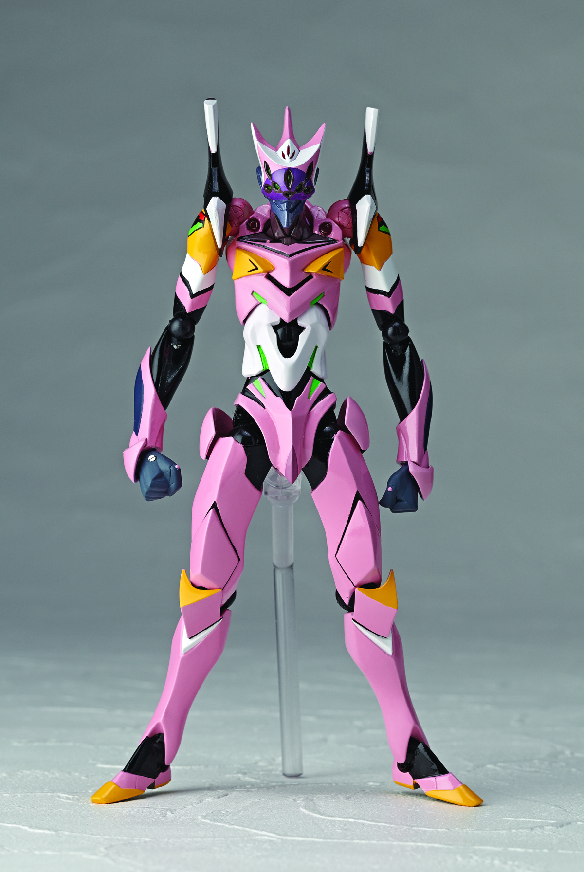 Evangelion Type-08 Beta, standing just over 6" tall with 22 points of articulation. Accessories include 6 optional hands, a handgun, a rifle, a defense unit, an AT field, a defense unit auxiliary rod, a display stand, extension and auxiliary parts, and a ribonucleic container.