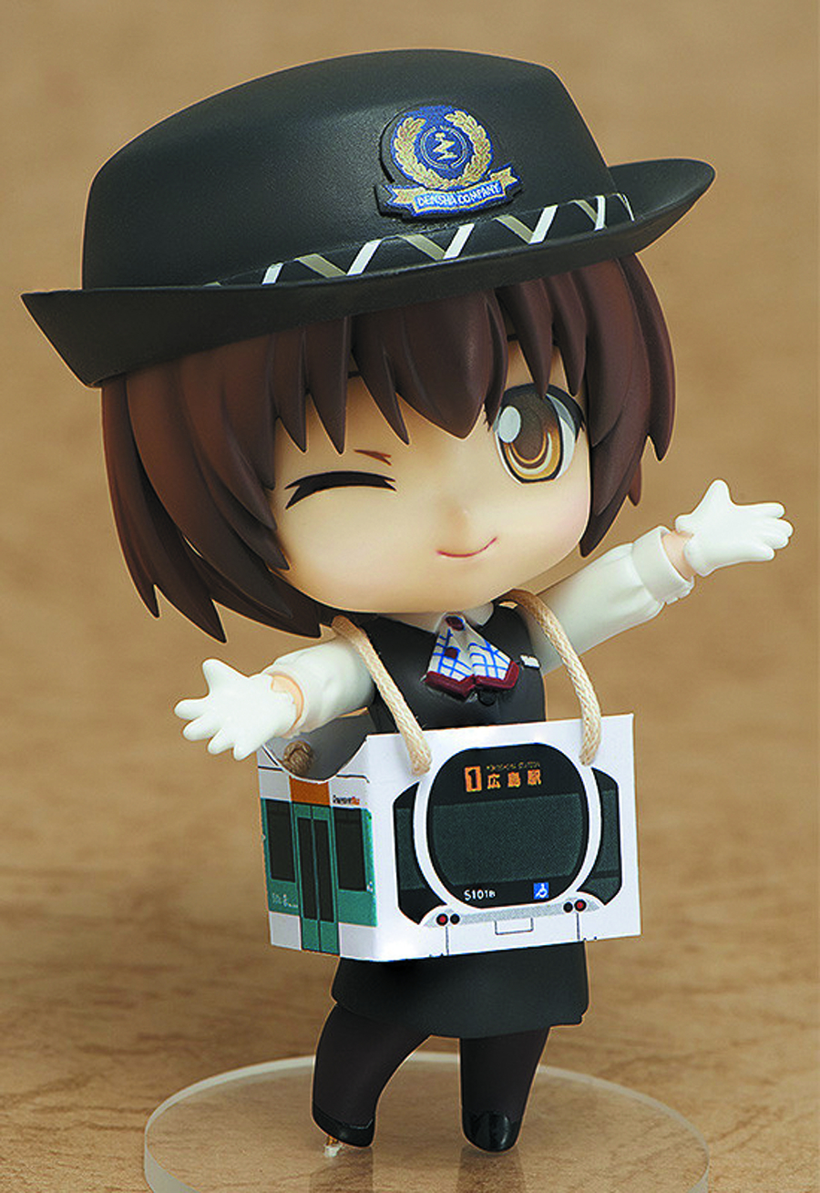 Tetsudou Musume comes a Nendoroid of Miyuki Takano, the character from Hiroshima Electric Railways who drives trams in Hiroshima city! Miyuki comes with the bag that all drivers on the Miyajima Line use, and she can be posed carrying it on her left arm. She can also be posed ready to greet customers on the tram, and for those who prefer a more comical pose, she also comes with some okonomiyaki and a torii archway to illustrate some of the popular attractions from the area she comes from! She even includes a "cardboard box train" which she can wear to pretend to be a train by herself, or instead you can make use of the included rope to share the fun with other characters in the series as well!