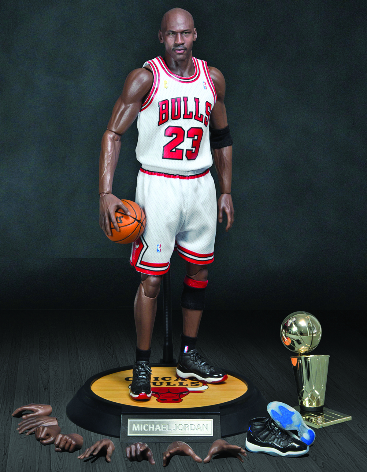 From Enterbay! The legend continues with this all-new figure, which features: a museum-like representation of Michael Jordan sculpted by Scuderia with an authentic likeness, hand-painted with a newly developed "multi-layer" paint application; a new NBA-MJ body with 30 points of articulation, scaled to Jordan's actual height (making this more of a 13" figure than a 12"); an accurate reproduction of his Chicago Bulls #23 team jerseys with shorts & black socks; one pair each of Air Jordan 11 (XI) #45 Space Jam and Air Jordan 11 (XI) Bred; a new figure stand with the Chicago Bulls logo; and a 1/6-scale NBA Championship Trophy.