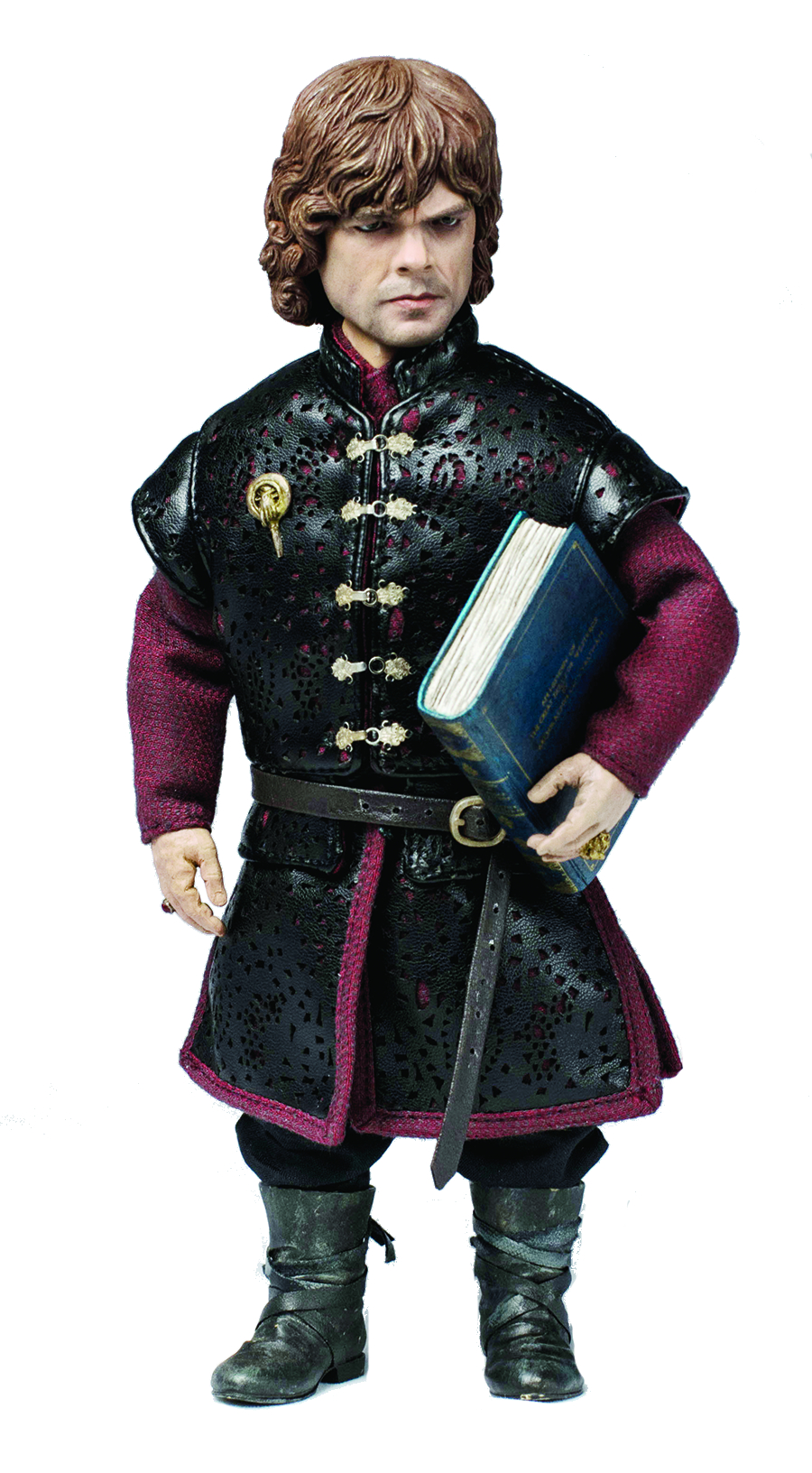 Game of Thrones, Tyrion Lannister, "The Imp," is sculpted for this 1/6-scale figure that stands 8 5/8" tall with a custom designed action figure body. The head sculpt features a realistic likeness of actor Peter Dinklage, and the figure comes with exchangeable hands, tailored cloth costume, leathers, trousers, doublet, jerkin, and boots. The figure also comes with goblet and book accessories. Taken together, this is among the most impressive