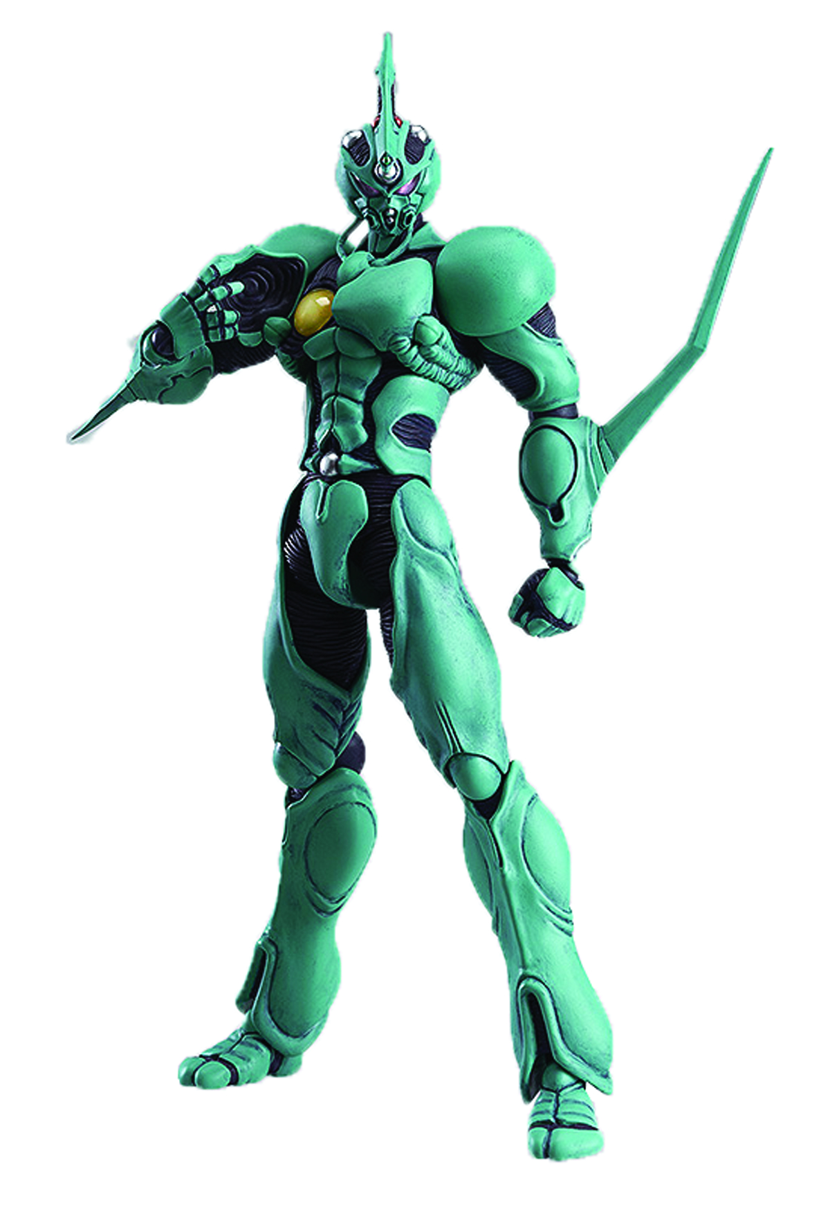 From Max Factory. The Bioboosted Armor is boosting its way into the figma series! Using the smooth yet posable joints of figma, you can act out a variety of different scenes. A flexible plastic is used for important areas, allowing proportions to be kept without compromising posability. The chest area can be opened and closed, and careful thought has gone into all points of articulation to allow for action poses similar to those from the series. A number of different hand parts - as well as his High Frequency Vibration Sword, Unit G - are all included. An alternate chest part is included to pose him using the Pressure Cannon. An articulated figma stand is included.