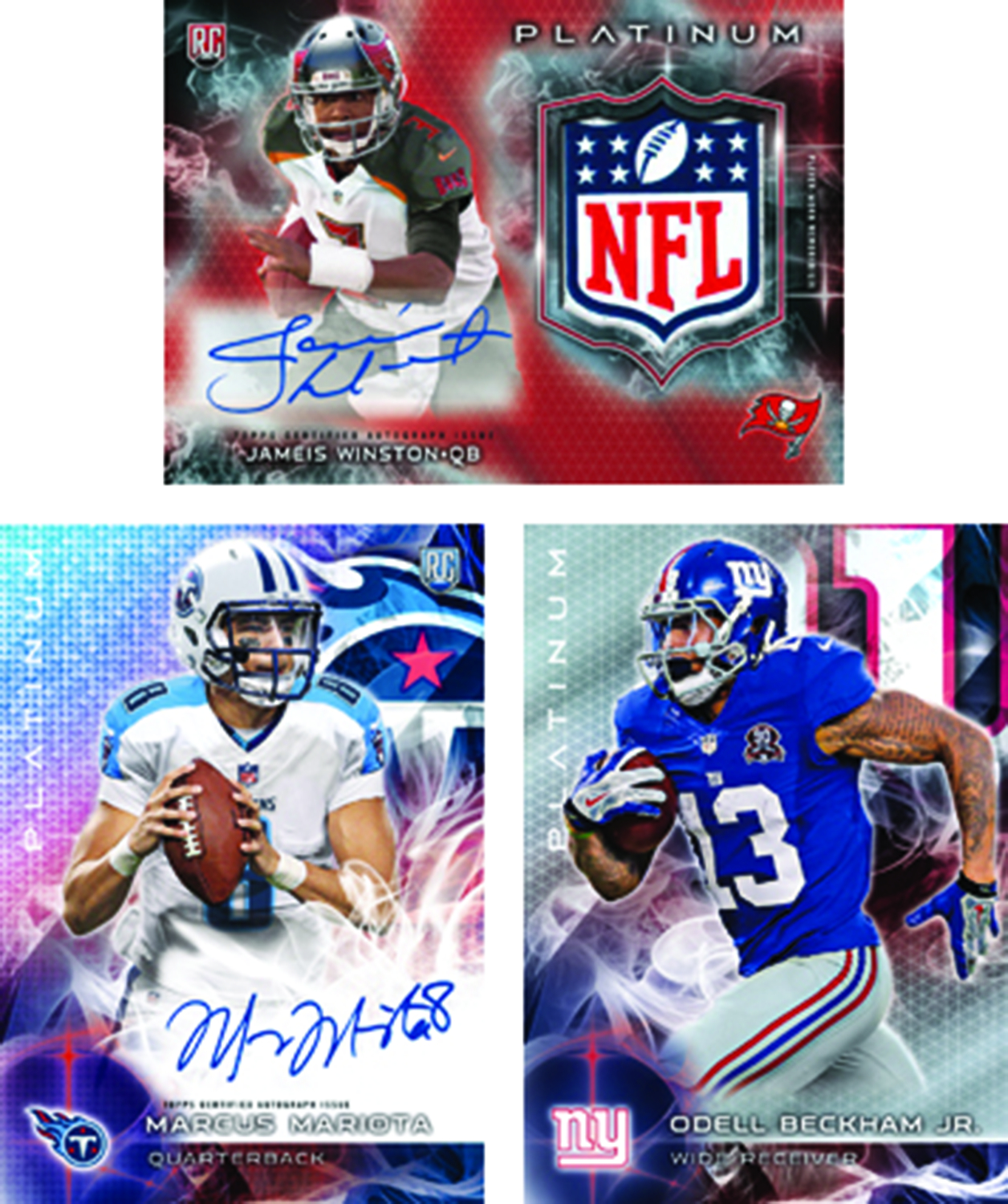 Topps Platinum is back in 2015 with new, high-end designs featuring autograph cards from the top NFL rookies from the 2015 NFL draft class! Each box contains 2 Autographed Rookie Cards, 1 Autographed Rookie or Veteran Patch Card, 5 X-Fractor Parallel Rookie Cards, 1 Black Refractor Parallel Rookie Card and 1 Platinum Die-Cut Rookie Card. In addition to a base series of 100 Veterans and 50 Rookies, look for: Autographed Rookie Cards; Dual Autographed Rookie Cards; Hexagraph Double-Sided Rookie Cards; BCA Die-Cut Ribbon Autograph Cards; STS Die-Cut Ribbon Autograph Cards; Platinum Players Die-Cut Rookie Autograph Cards; Autographed Rookie Refractor Patch Cards; Autographed Veteran Refractor Patch Cards; Dual Autographed Dual Patch; and Platinum Rookie Autographed Patch Cards (1 per case). Plus: Platinum Die-Cut Rookie Cards (1 per box); BCA & STS Die-Cut Ribbon Cards (1 per case); Veteran Gold Parallel Cards; and Parallel Rookie Cards featuring chrome technology. All this, plus Refractors. X-Fractors, Printing Plates and more! 5 cards per pack. 20 packs per box.
