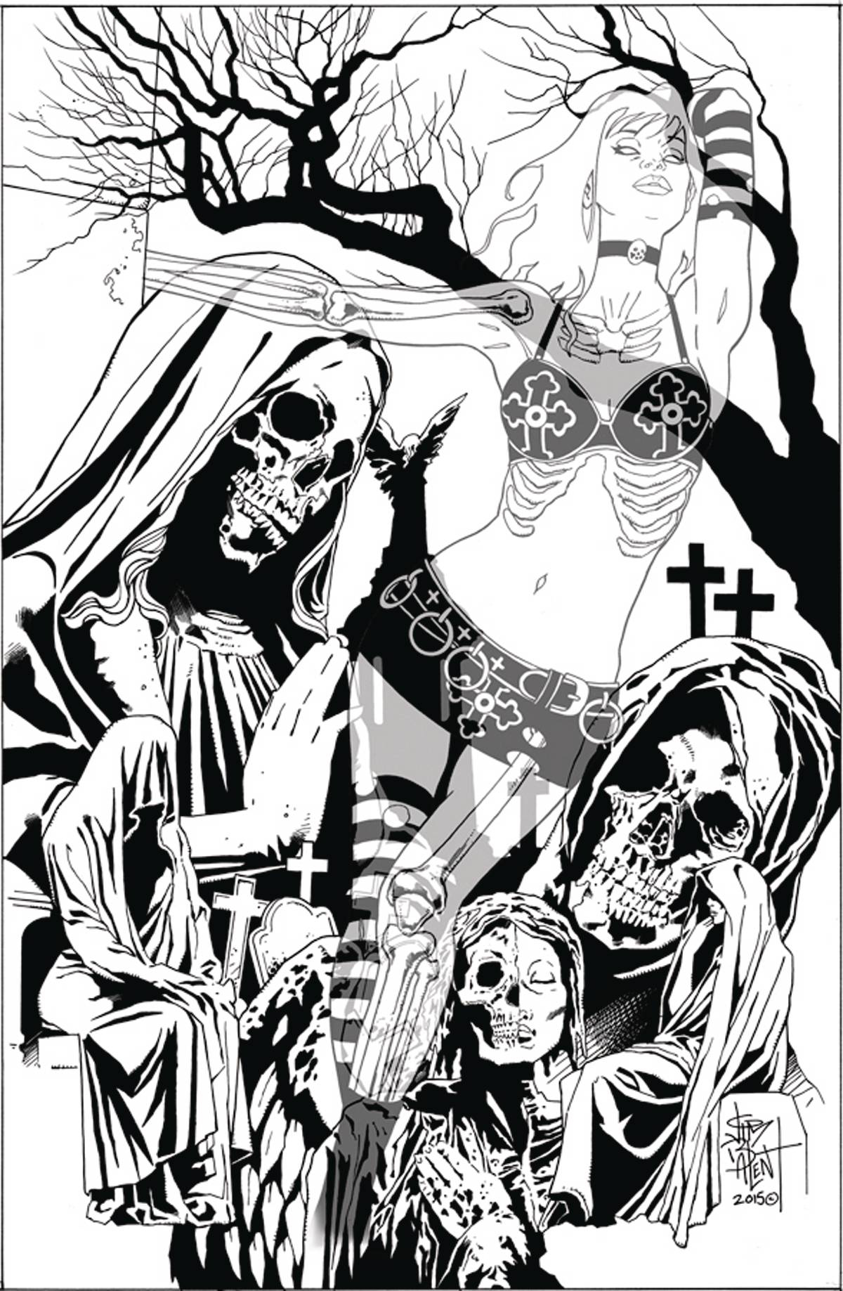 Tarot #94 features the elegant lines of Jim Balent's "Black & White" ink version our Graveyard Girl, Crypt Chick. This edition comes bagged and boarded with an art print of the same illustration - but in full-color and sans her Rocker outfit! To see the art print, visit