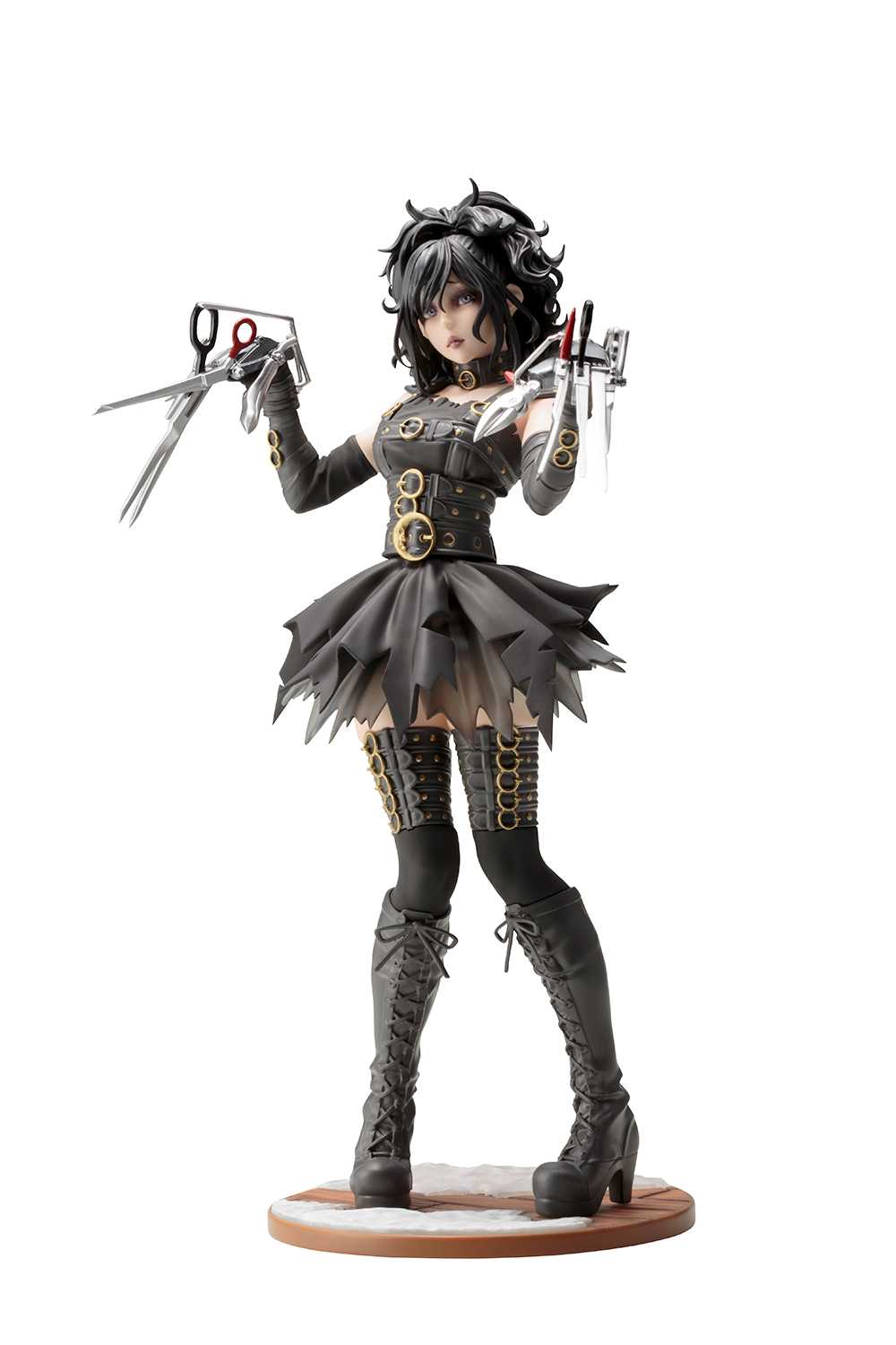 A KOTOBUKIYA Japanese import! Kotobukiya's elite Bishoujo Statue line has brought you beautiful characters from all manner of anime series, DC and Marvel comics, Star Wars, video games, and much more. Recently the series took a totally unique turn, transforming two horror movie icons into pretty girls with Jason Voorhees and Freddy Krueger. Now a third gender-bending film star joins the party with a stunning new Bishoujo interpretation of EDWARD SCISSORHANDS! Tim Burton's classic 1990 dark fantasy introduced the world to Edward (played magnificently by Johnny Depp), a gentle automaton with unfinished scissor hands created by a mad scientist. Now that character's iconic appendages, color scheme, and style have been interpreted by Kotobukiya based on an original illustration by Shunya Yamashita that brings Edward to life as never before. The beautiful female version stands with all the awkwardness of the film character, her feet apart and knees spread, head cocked to one side, and scissor hands held up in front of her. "Edward" wears a fantastically detailed black gothic-style outfit with tall boots, stockings, a short dress with shredded skirt, long gloves, and a choker at her neck. The darkness of her clothing is offset by striking gold buckles and studs, and of course the silver blades of her scissors. Meanwhile, under her tousled black hair this unique creature silently ponders the world with a cute expression on her Bishoujo-styled face. Edward Scissorhands stands 9 inches tall (1/7 scale) on a special themed display base.