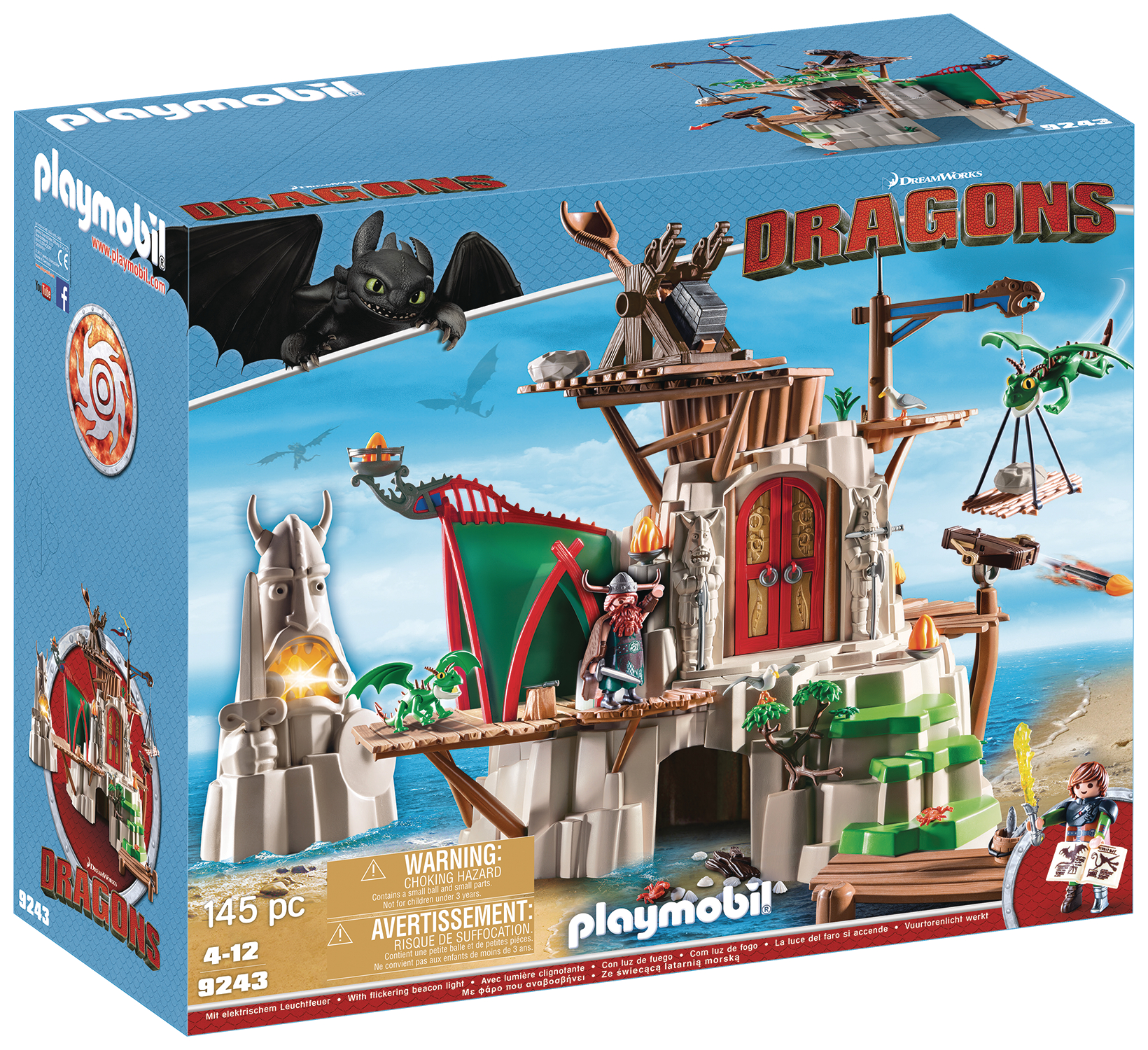 On the island of Berk, dragon-riding is a must! Here, young Viking warriors befriend dragon companions, and together, they keep an eye out for trouble that might threaten their home. Berk's two-story fortress features a functioning catapult capable of defending the fortress from high above, a fiery crossbow ready to strike down enemies, and a functioning pulley to transport supplies. Stoick, the Viking leader, stands within the walls of the fortress overseeing the community and readying for any enemy attacks. His son Hiccup is ready for action with his flame sword and is Berk's resident expert on dragons and dragon-riding. At night, the functioning torch and Viking statue illuminate the fortress (3 x AAA batteries required). Set also includes awning, trapdoor, two dragons, torches, boulders, and tons of other accessories. Recommended for ages four to twelve.